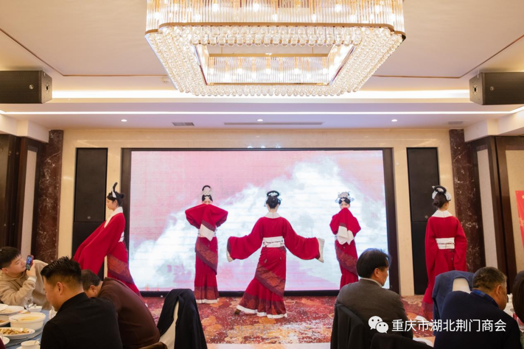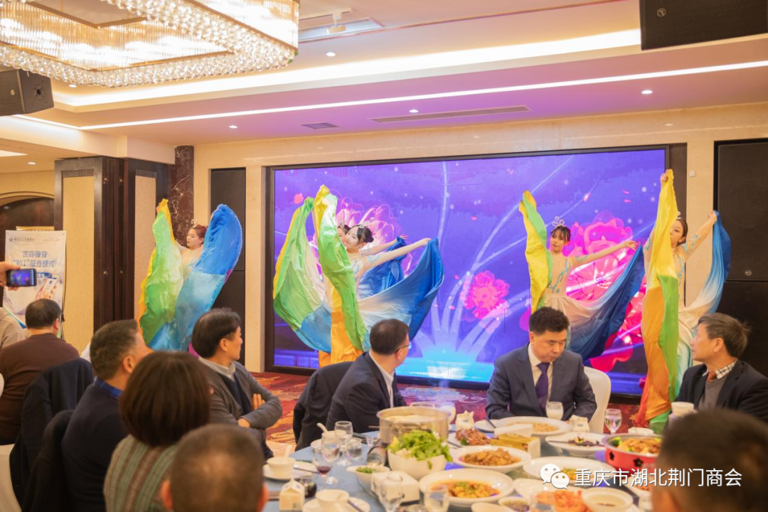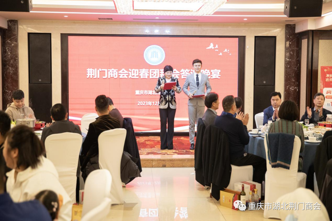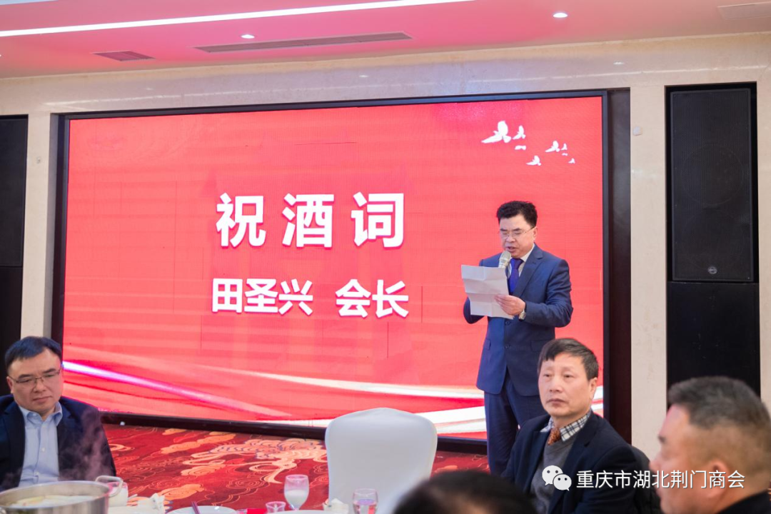 在迎春团拜会答谢晚宴上,一支《奔向辉煌》舞蹈拉开帷幕,会长田圣兴致欢迎词:代表理事会对过去一年里,给予商会各项工作关心和大力支持的各位领导、各兄弟商会、顾问团老领导、在渝荆门籍老乡、各界朋友、各位会员及家属致以衷心感谢和新春祝福!对即将到来的2024年充满希望,坚信2024年的春天会更加美好!