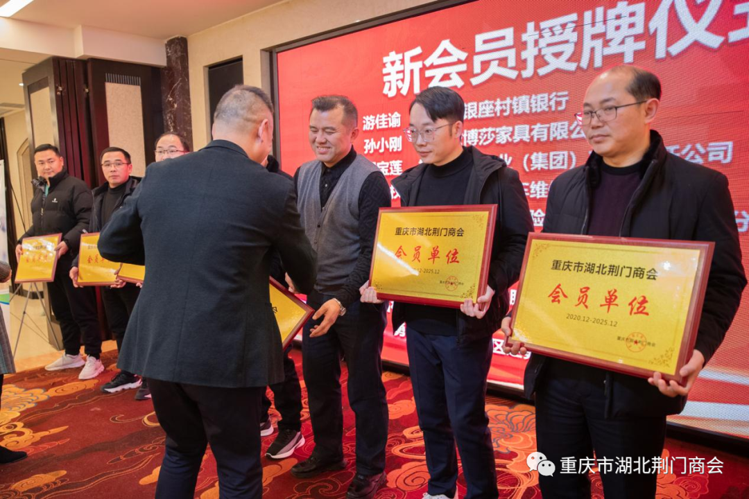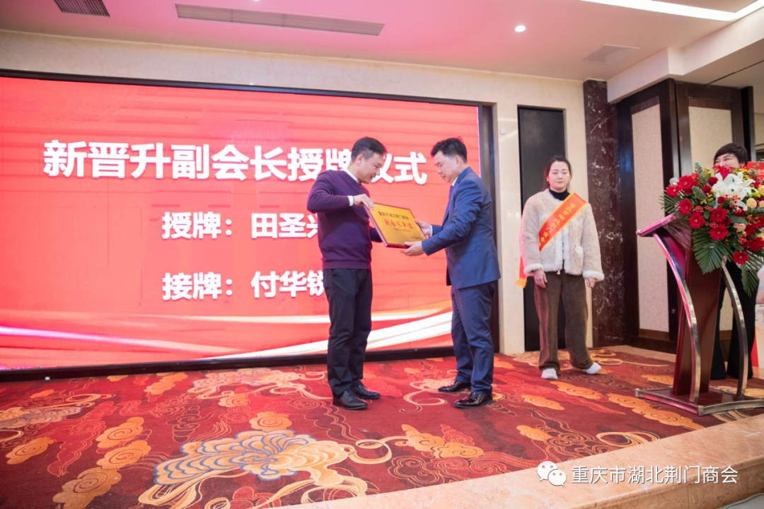 会上,商会常务副会长许贤华、党支部书记、副会长邹琪秀、会长田圣兴分别为11家新会员单位代表、1家新副会长单位授牌。商会今年发展了18家会员单位,吸纳了一批优秀人才和知名企业加入商会,为筑牢商会队伍注入新鲜血液,进一步激发了商会持续健康发展的内生动力。新晋升为副会长单位一一重庆五进健康咨询中心总经理付华锐代表新会员作了发言,对本公司情况作了简要介绍,他说,非常荣幸加入荆门商会这个团队,有了回家的感觉,希望各位新会员在商会领导班子带领下,诚信守法、凝心聚力、团结奋斗、共谋发展!