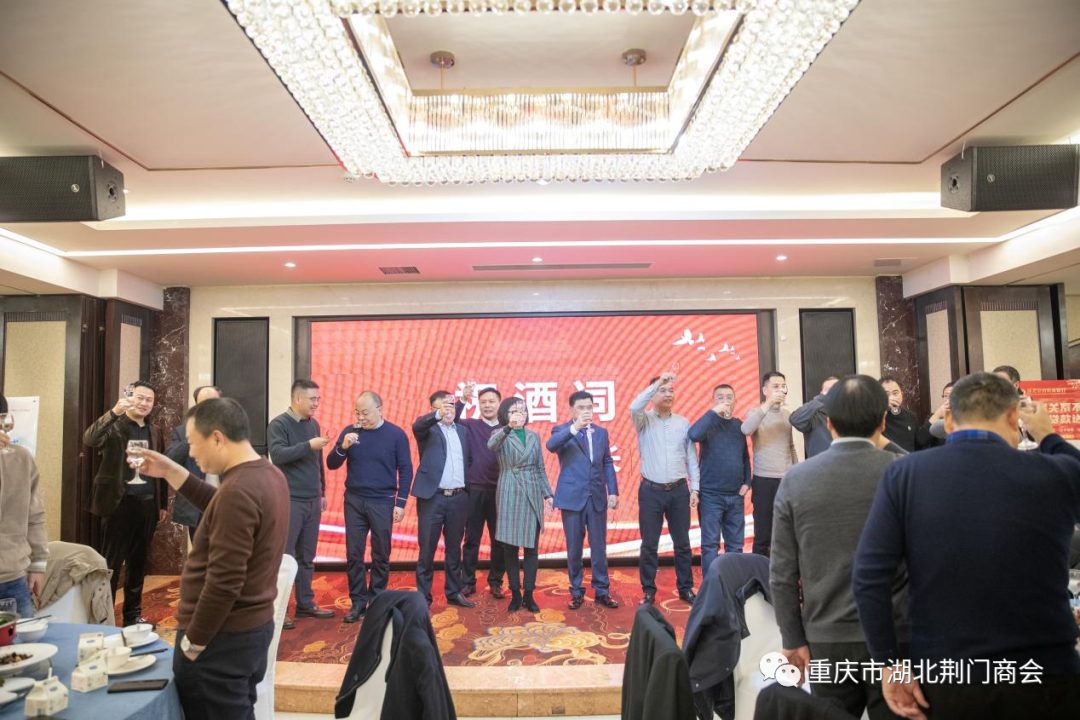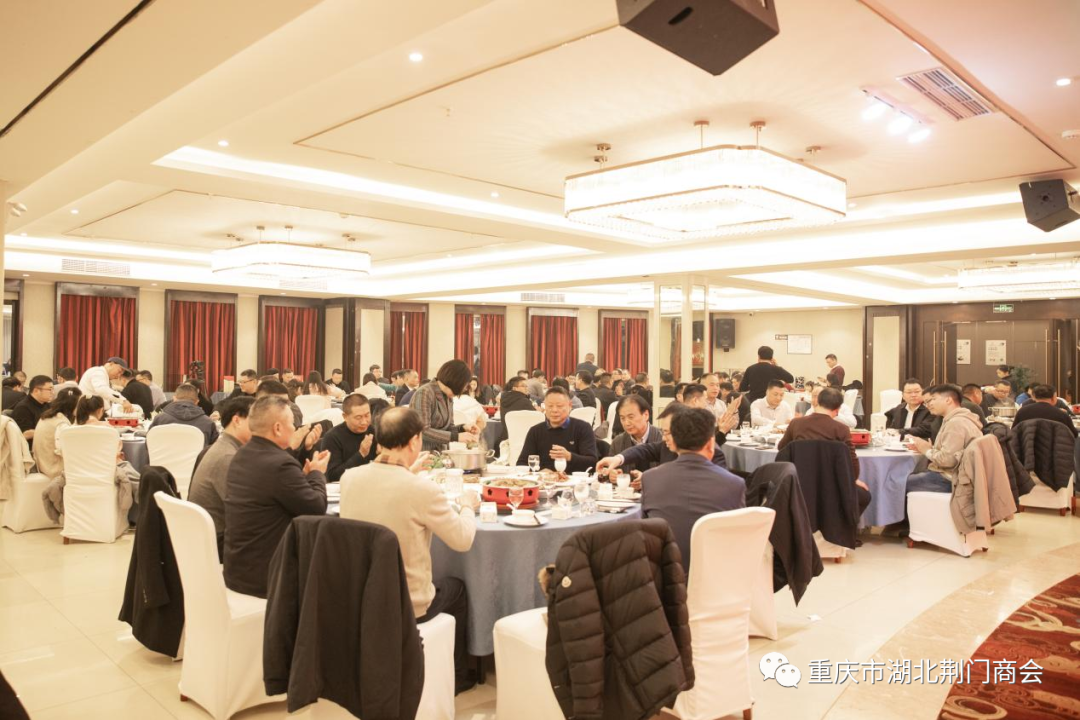 重庆市湖北商会党委书记、执行会长李儒冠、监事长陈文学、常务副会长龙波、专职副会长王双泉、秘书长王文杰,重庆市湖北潜江商会会长周超德、监事长皮传荣、常务副会长万江平,重庆市湖北黄石商会常务副会长石杰才,湖北省荆门市农村商业银行副行长薛先武、京山市农村商业银行副行长肖永华、钟祥市农村商业银行副行长全以军,沙洋县驻川渝地区招商组组长、沈集镇镇长戴泽及随员,在渝湖北籍商会秘书长、秘书,荆门商会顾问团成员,在渝荆门籍企业家及有关人士,会员家属共计200余人应邀参加了团拜会。