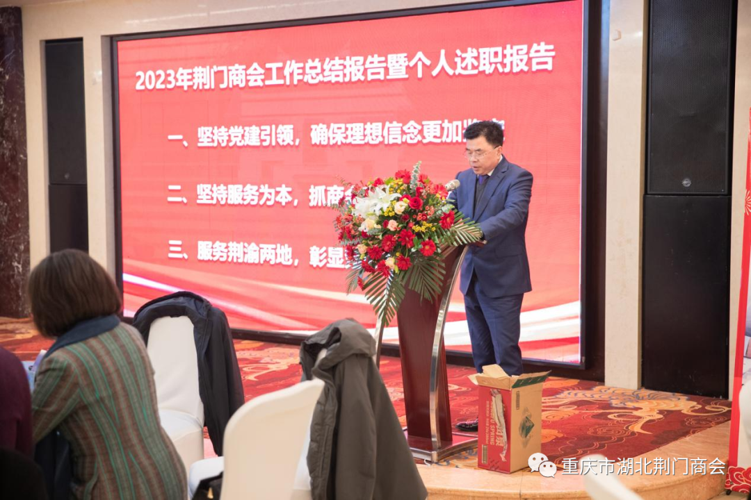 荆门商会一届四次会员大会在雄壮的《中华人民共和国国歌》声中拉开序幕,会长田圣兴代表商会理事会作了《荆门商会2023年度工作总结报告暨会长个人述职报告》,报告从“坚持党建引领、确保理想信念更加坚定;坚持服务为本、抓商会建设促发展;服务荆渝两地、彰显楚商力量”三个方面全面总结了商会工作,同时指出了存在不足和改正措施,并对2024年商会工作提出了初步计划和安排。