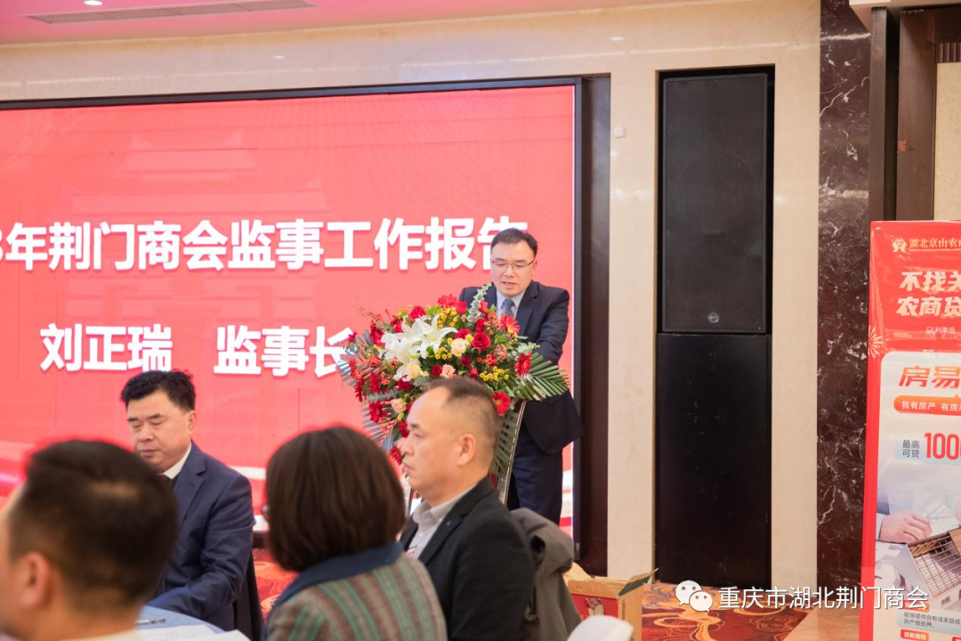 监事长刘正瑞代表商会监事会作《荆门商会2023年监事工作报告》,报告全面回顾了商会监事工作情况,从政治引领、商会建设、诚信自律、履职尽责、财务规范、发展会员、融合共促等方面进行了认真总结,并提出了监事会2024年的初步计划和安排。