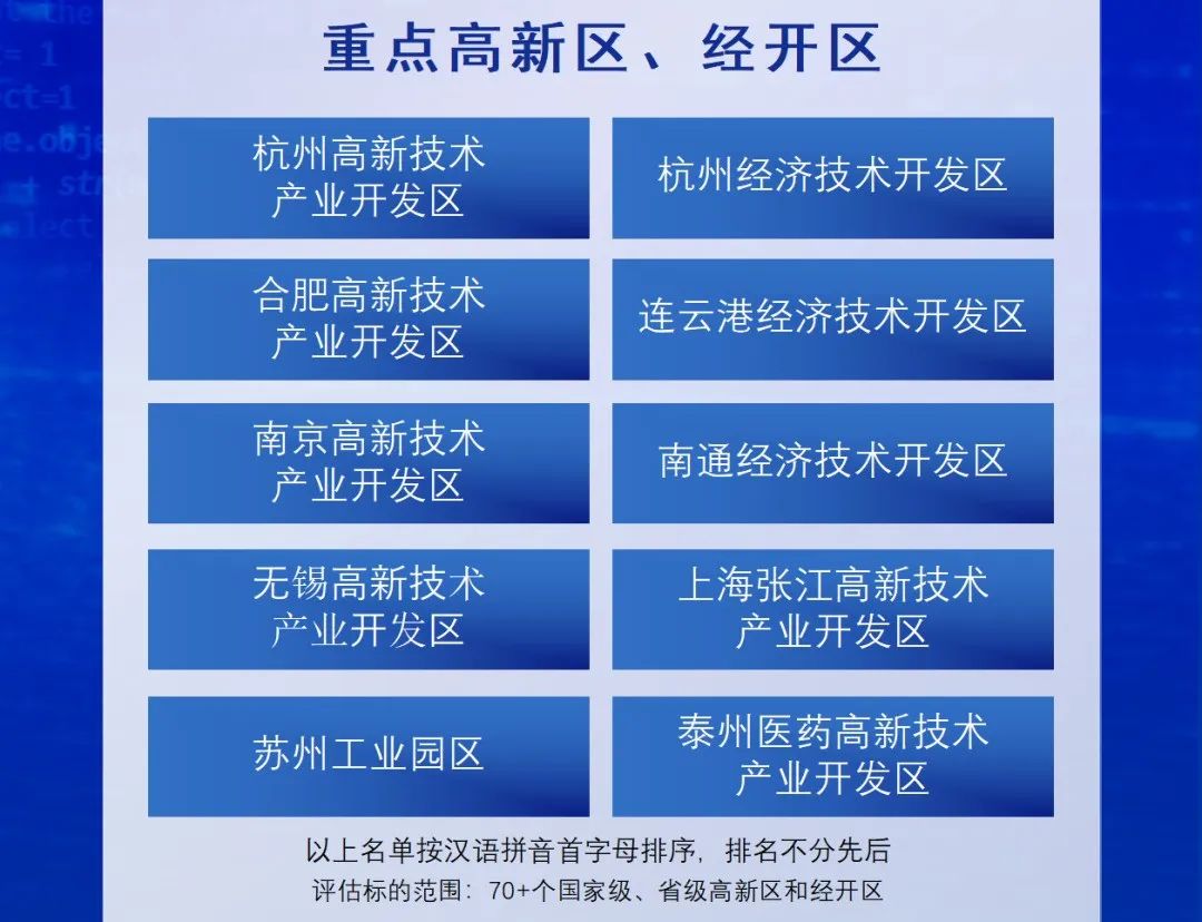 在长三角10大重点高新区、经开区中,总体呈现集聚发展态势。江苏省实力最强,入围数量达到6个,分别为连云港经济技术开发区、南京高新技术产业开发区、南通经济技术开发区、无锡高新技术产业开发区、苏州工业园区和泰州医药高新技术产业开发区;浙江省占据两成席位,杭州高新技术产业开发区和杭州经济技术开发区成功入榜;其余两个入榜区域分别为上海张江高新技术产业开发区和合肥高新技术产业开发区。