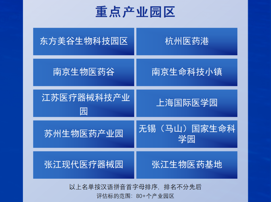 10大重点产业园区地域集中度更为明显,上海市和江苏省入榜的产业园区最多,分别占据4席,其次为浙江占据2席。从城市分布来看,上海有4个产业园区入榜,分别为东方美谷生物科技园区、上海国际医学园、张江现代医疗器械园、张江生物医药基地;南京和苏州各有两个产业园区入榜,分别为南京生物医药谷、南京生命科技小镇,以及江苏医疗器械科技产业园、苏州生物医药产业园,剩余2个席位分别为杭州医药港和无锡(马山)国家生命科学园,这些重点产业园区均是各地生物医药产业发展的核心区、产业要素的集聚区。