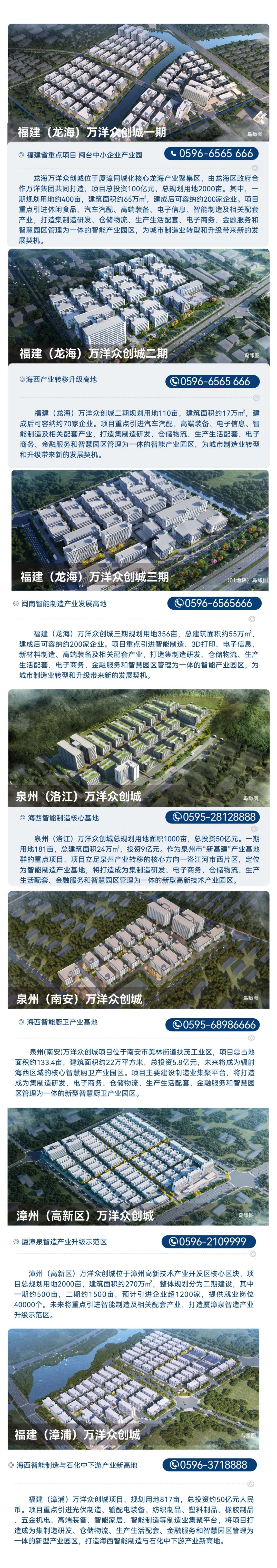 漳浦万洋众创城项目总规划用地817亩,总投资约50亿人民币,项目一期占地378亩,规划建筑面积约42万㎡;项目规划配备有标准厂房、定制厂房、火车头钢结构厂房、人才公寓、商业配套等,未来将打造成为海西智能制造与石化中下游产业新高地。