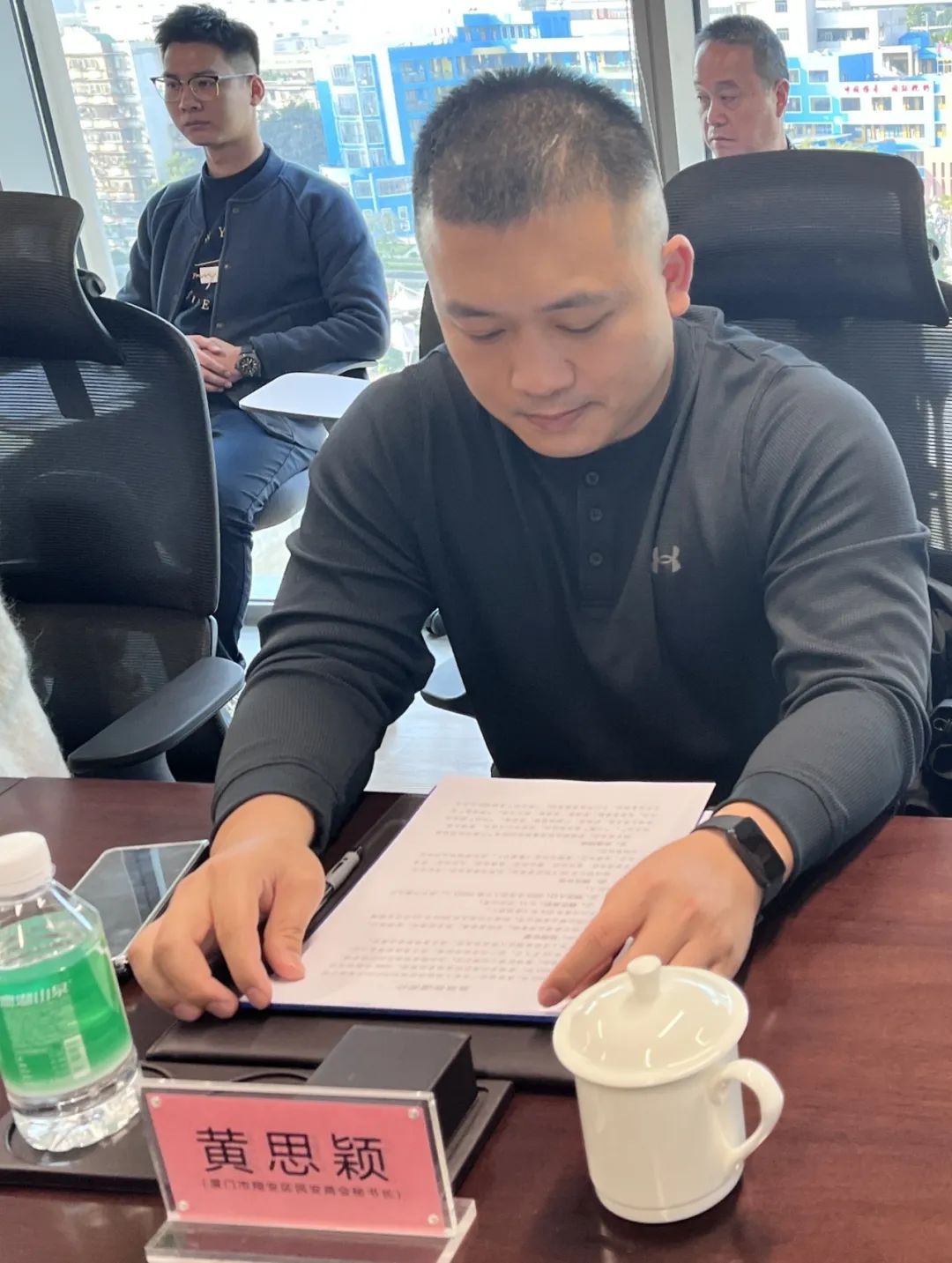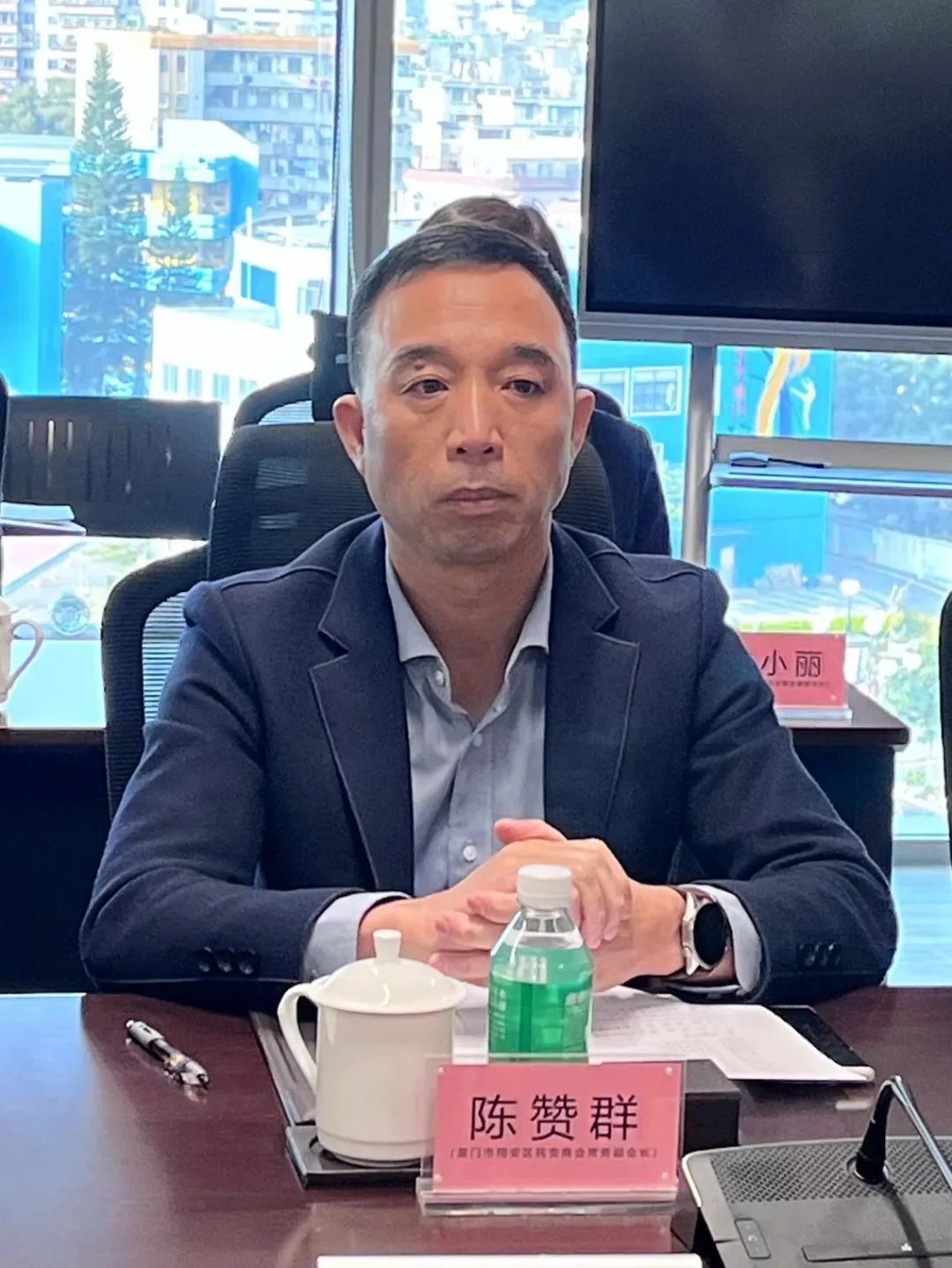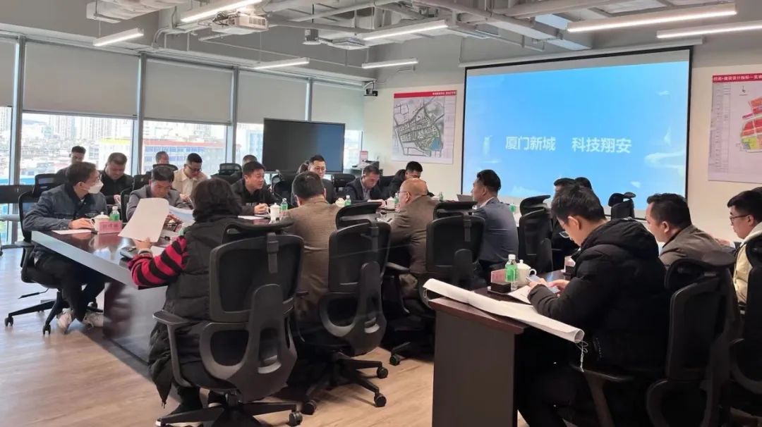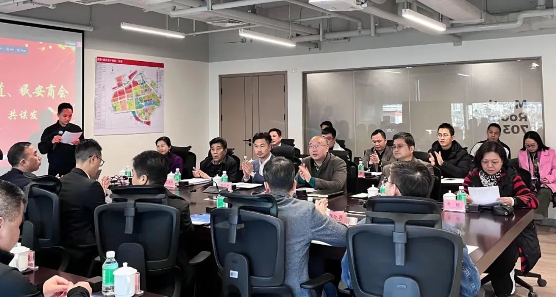 随后,在万科黄埔新城会议室,双方进行座谈交流。厦门市翔安区民安街道书记叶捷频首先发言,介绍了翔安区民安街道的调研目的及近年来在城市管理、经济发展等方面的取得的显著成绩。