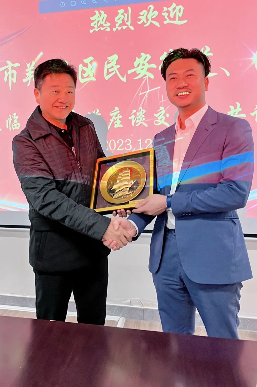 在领导们的精彩发言之后,双方商会会长共同签署了一份战略合作协议。这份协议不仅代表着两地商会的友好合作,更是双方未来合作的坚实基石。为了表达对这一重要时刻的敬意,双方商会会长还亲自交换了象征着各自地区文化的精美礼物,共同见证着两地城市友谊的深厚。愿鱼珠·民安携手共创更加美好的未来。