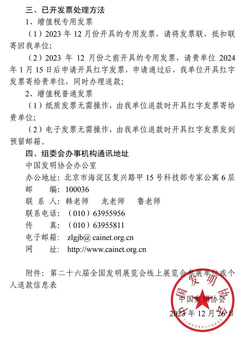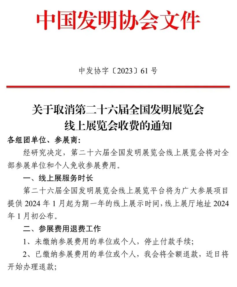 关于取消第二十六届全国发明展览会线上展览会收费的通知