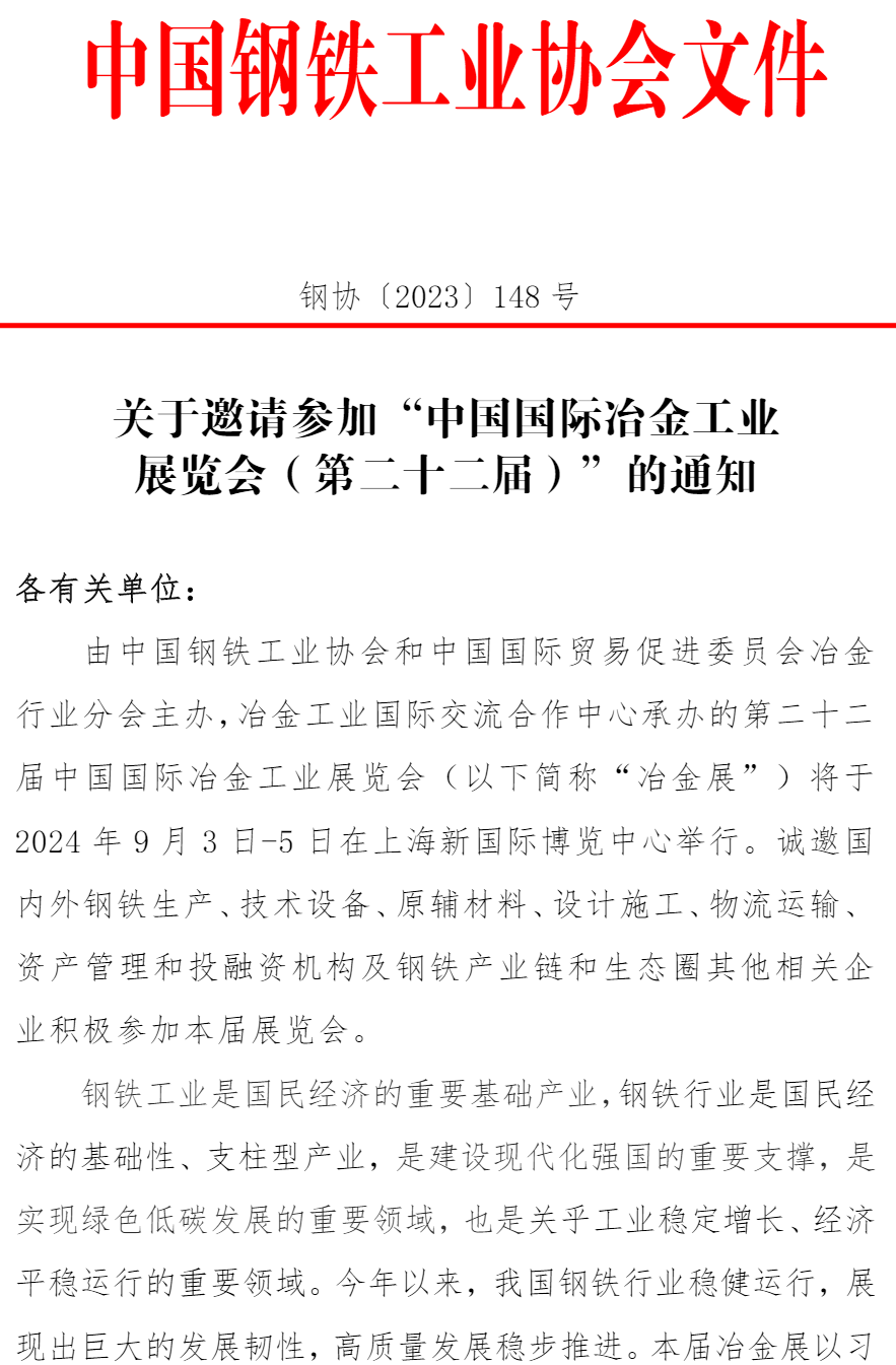 关于邀请参加“中国国际冶金工业展览会(第二十二届)”的通知