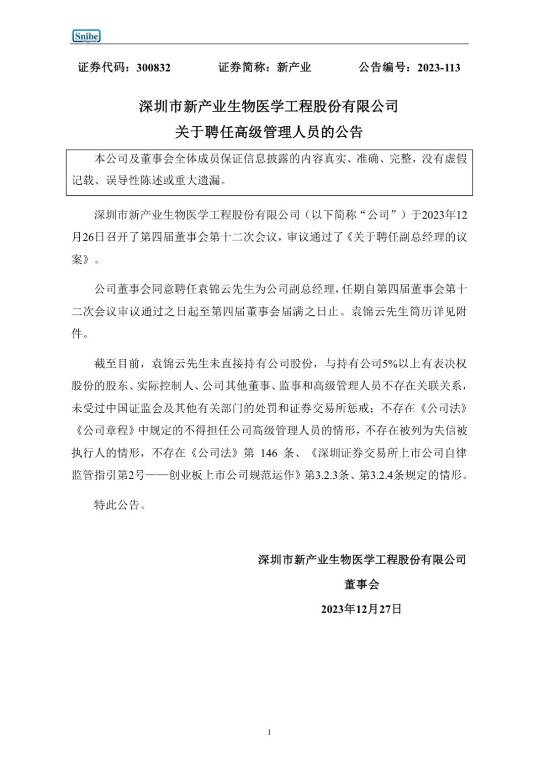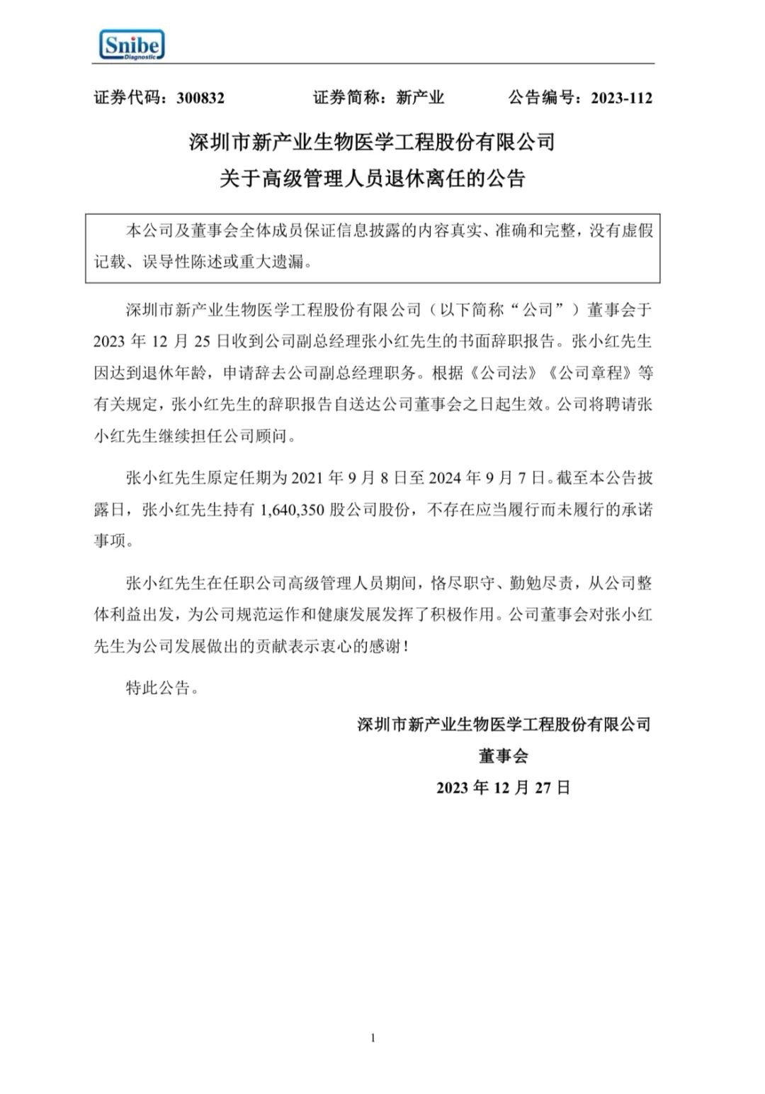 12月26日晚间,深圳市新产业生物医学工程股份有限公司发布公告称,董事会于2023年12月25日收到公司副总经理张小红先生的书面辞职报告。张小红先生因达到退休年龄,申请辞去公司副总经理职务。