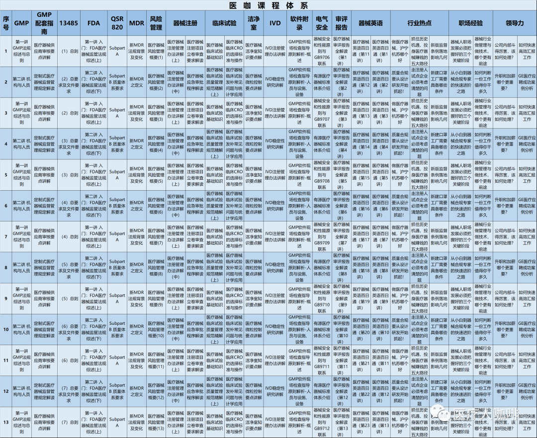 我们开设医咖网上课堂的初心就是为了方便大家学习,特别是利用零碎的时间利于上下班路上,饭后睡前的时间,能够随时随地系统性地学习医疗器械法规知识。医咖网上课堂开播四年多来,先后开设了GMP体系、13485、FDA、无菌、有源、注册、软件合规、器械英语、审评报告、全面质量管理、职场等800多节课程,深受业界欢迎!