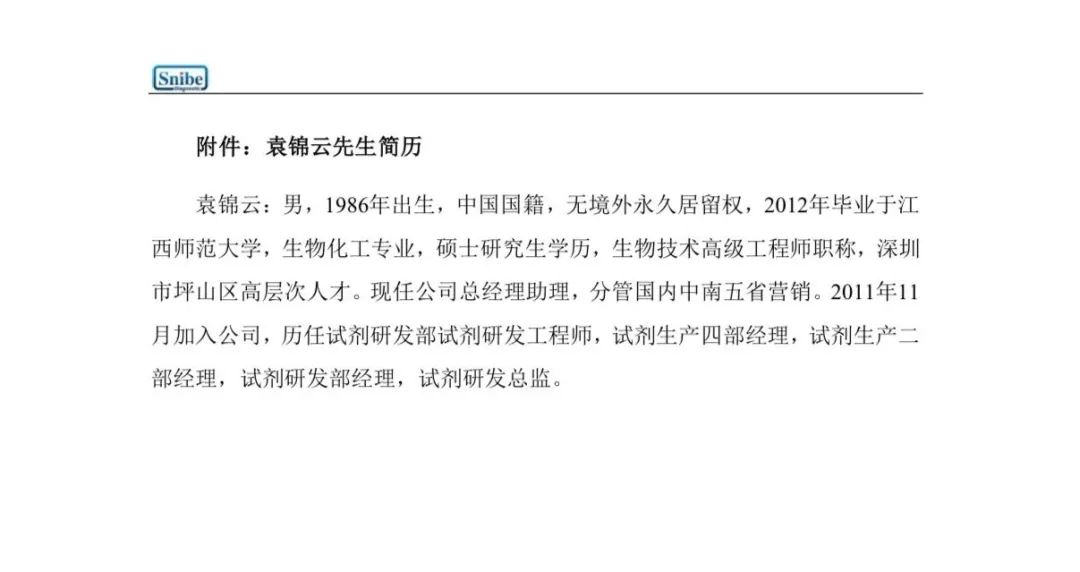 袁锦云:男,1986年出生,中国国籍,无境外永久居留权,2012年毕业于江西师范大学,生物化工专业,硕士研究生学历,生物技术高级工程师职称,深圳市坪山区高层次人才。现任公司总经理助理,分管国内中南五省营销。