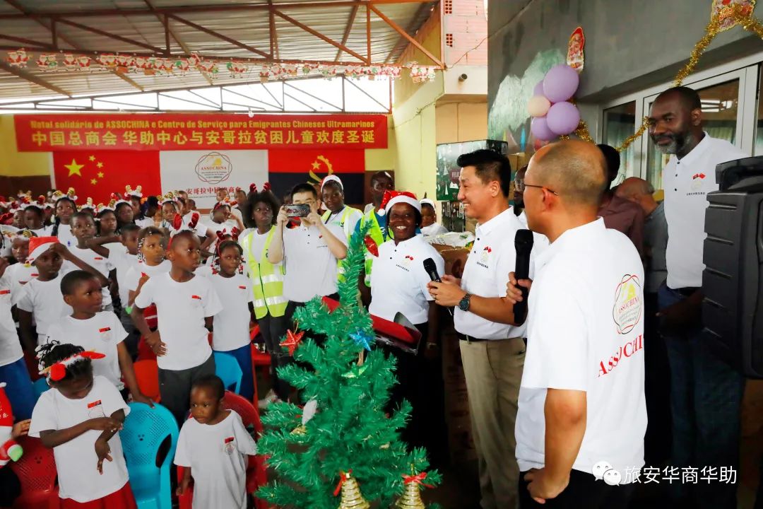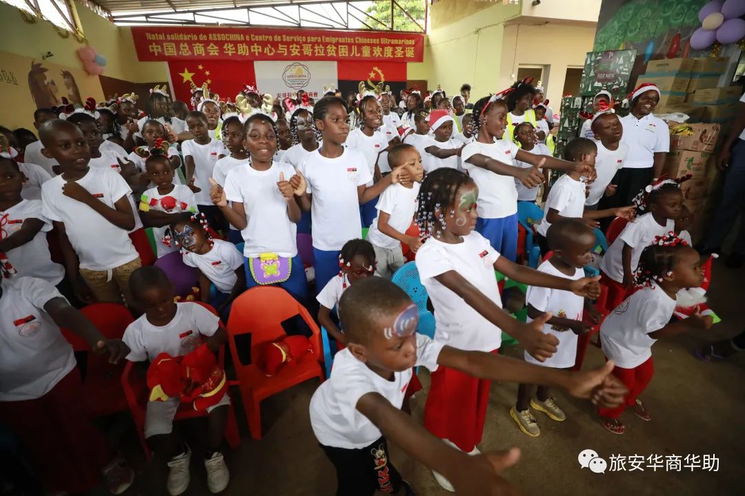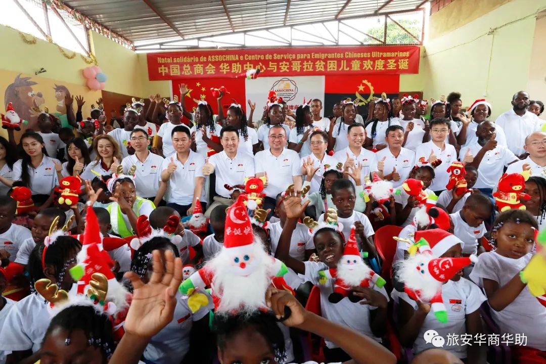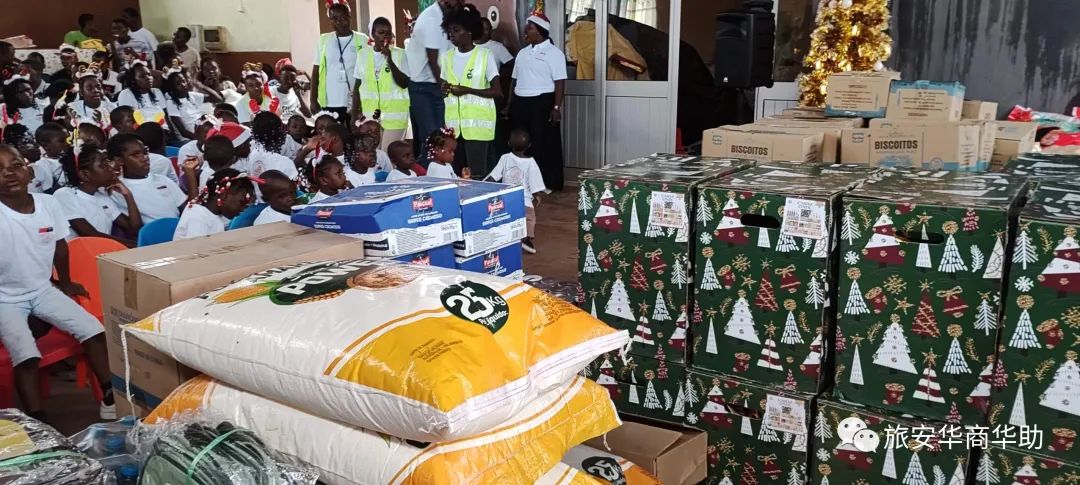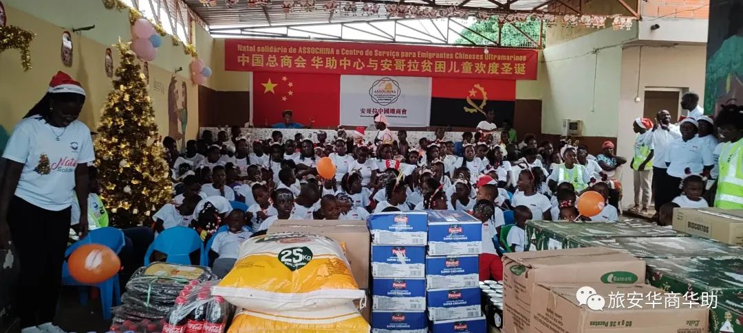 当地时间12月22日下午,中国总商会、华助中心与安哥拉上百名贫困儿童欢度圣诞。牛奶、果汁、饼干、巧克力、肉类、麦片、食用油、醋、米、玉米粉、意大利面、面粉、糖、芝士、香肠、蜂蜜等生活物资,学习用品和圣诞礼物堆满了孤儿院。