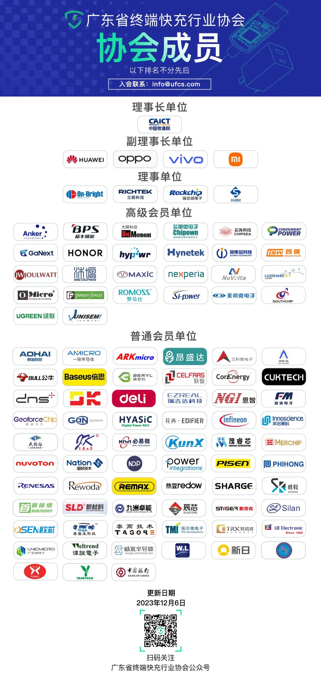 全国首家电子消费类终端快充行业协会,由中国信息通信研究院、华为、OPPO、vivo、小米及国内手机厂商牵头发起,联合国内终端整机、充电芯片、仪表仪器、充电器、配件等终端快充产业链各方共同筹建。致力于协同和整合产业资源,推动充电技术的标准化、产业化应用和推广,减少电子垃圾和能源浪费。