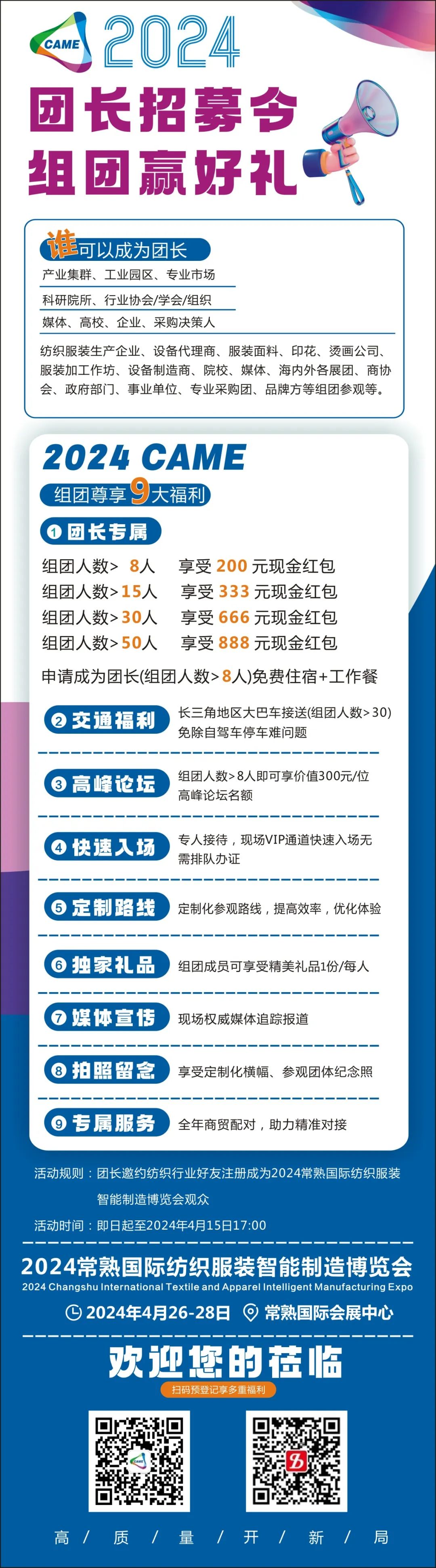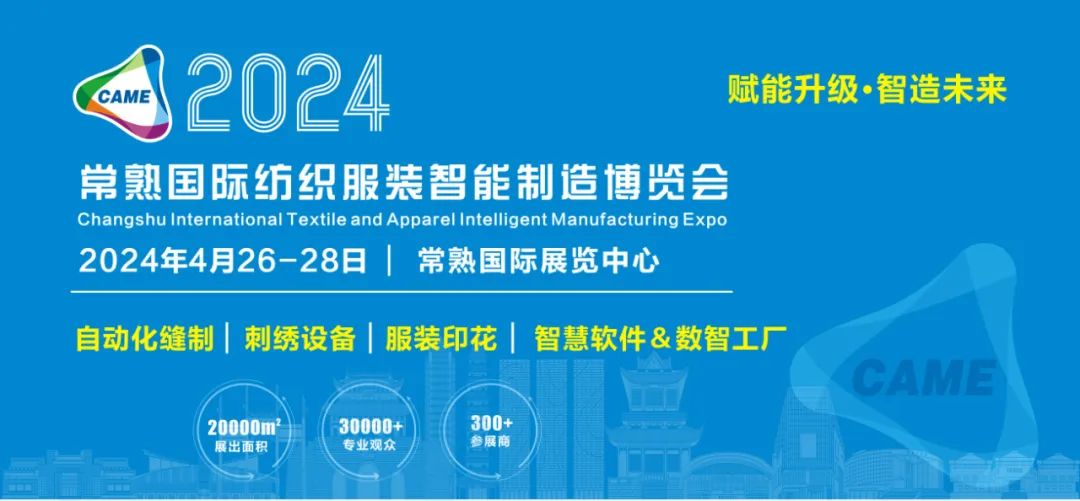 2024年 4月 26-28日,常熟国际纺织服装智能制造博 会(CAME2024)将继续在常熟国际展览中心举办。博览会以“赋能升级·智造未来”为主题,以市场需求为导向,全力打造纺织服装供应链一站式采购平台,展品涵盖自动化缝制、服装印花、刺绣设备、智慧软件&数智工厂四大板块,全方位展示服装智能制造新设备、新技术,加快推进长三角服装产业“智能化改造”和“数字化转型”。