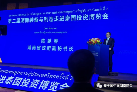 泰国站活动为期三天,是湖南装备与制造走进东盟投资博览会的第二站活动。本次活动旨在加强湖南省与东盟各国在装备制造与特色轻工领域的交流与合作,近60家企业受邀参展,集中展示工程机械、农业机械、箱包皮具、五金工具、智能家电、食品和农产品、商贸物流等领域的创新产品和技术。在开幕式及经贸交流座谈会等环节,泰国工业部部长萍帕塔拉·维猜坤致辞;中国驻泰国大使馆经商处参赞张潇潇致辞;湖南省商务厅厅长沈裕谋致辞;泰国湖南商会会长刘纯鹰发言;湖南省人民政府副秘书长陈献春致辞并宣布开幕。