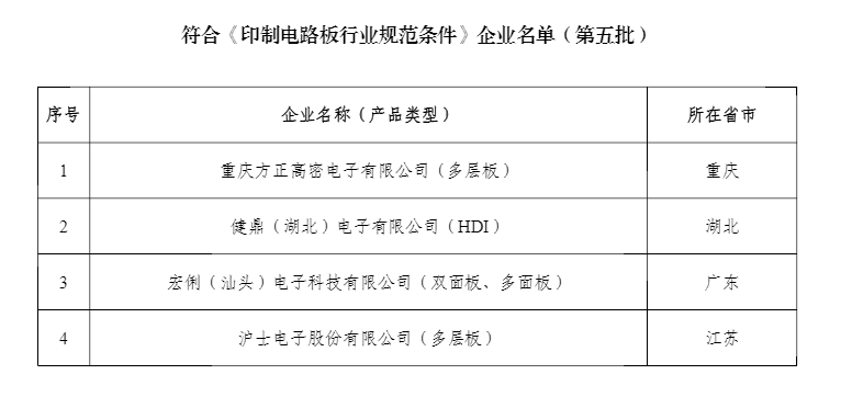 根据《印制电路板行业规范条件》及《印制电路板行业规范公告管理暂行办法》规定,经企业申报、省级工业和信息化主管部门推荐、专家复核、现场核查、网上公示等程序,确定符合《印制电路板行业规范条件》企业名单(第五批)。