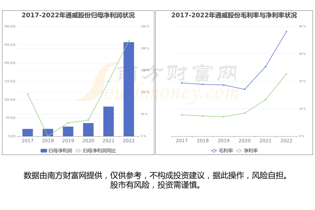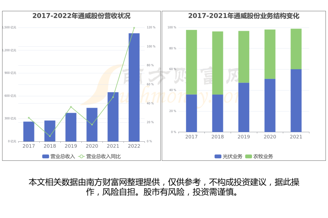 通威股份创始于1995年12月8日,2004年3月2日在上海证券交易所上市,股票代码600438。公司主营业务为水产饲料、畜禽饲料等的研发、生产和销售以及高纯晶硅、太阳能电池等产品的研发、生产、销售。
