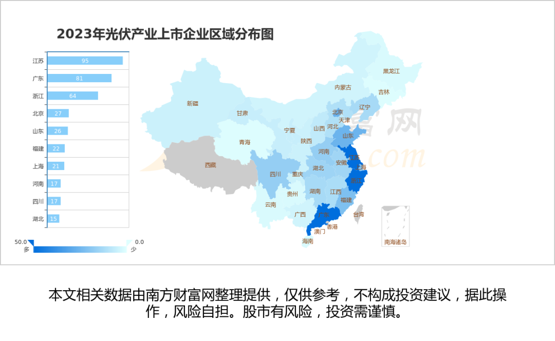 从上市公司地区的分布情况来看,A股506家光伏相关上市公司分布在江苏、广东、浙江、北京、山东等省市,总体来看主要集中于华东区域。