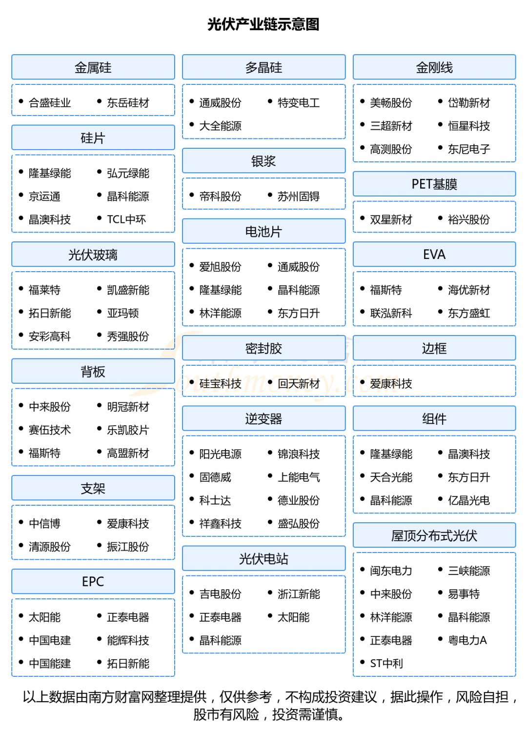 光伏产业链包含金属硅、多晶硅、金刚线、硅片、银浆、PET基膜等环节。金属硅公司主要包括合盛硅业、东岳硅材;多晶硅公司主要包括通威股份、特变电工、大全能源;金刚线公司主要包括美畅股份、岱勒新材、三超新材、恒星科技、高测股份、东尼电子;硅片公司主要包括隆基绿能、弘元绿能、京运通、晶科能源、晶澳科技、TCL中环;银浆公司主要包括帝科股份、苏州固锝;PET基膜公司主要包括双星新材、裕兴股份。