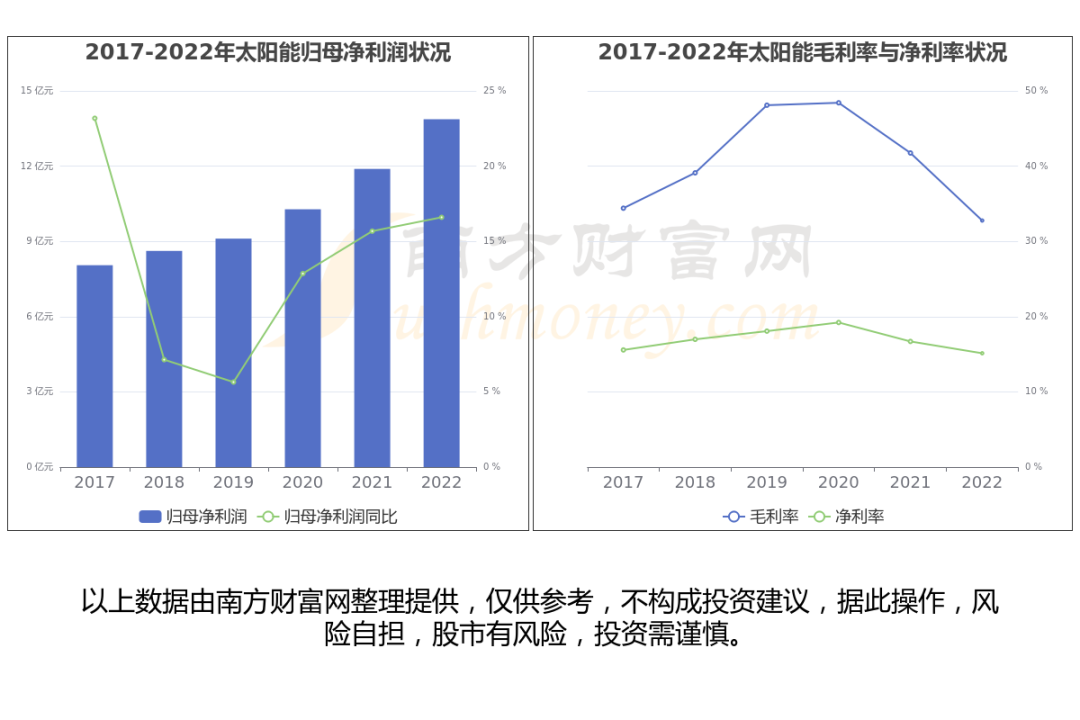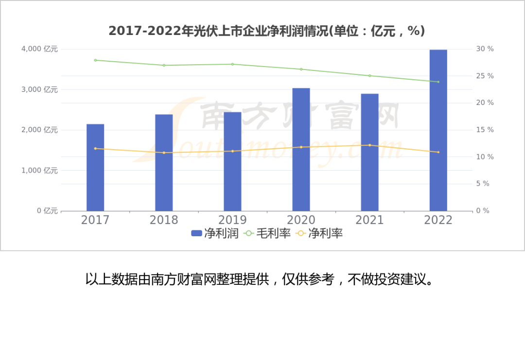 南方财富网趋势选股系统数据显示,2022年A股506家光伏相关上市公司总体归母净利润为3980.97亿元,同比增加37.56%,高于2021年水平。从光伏行业利润率来看,2022年平均毛利率23.91%,较2021年有所下滑,平均净利率10.88%,较2021年有所下滑。