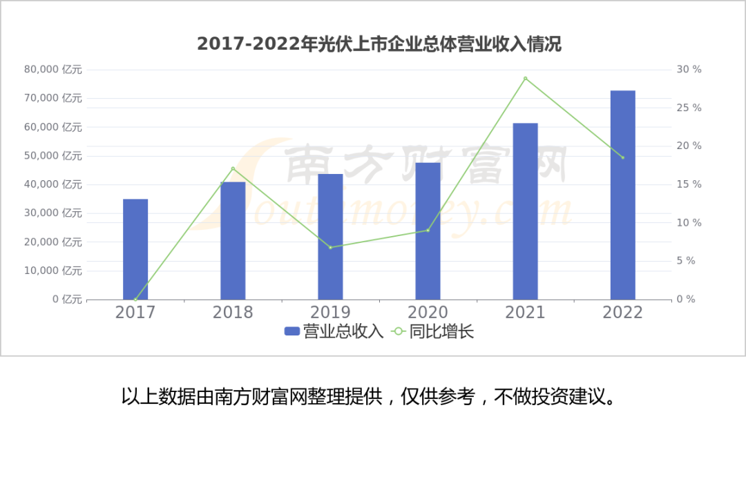 根据南方财富网趋势选股系统数据统计,A股光伏相关上市企业目前数量有506家,2022年总体营业收入约为72695.79亿元,同比增加18.51%。光伏上市公司2017至2022年总体营业收入情况如下: