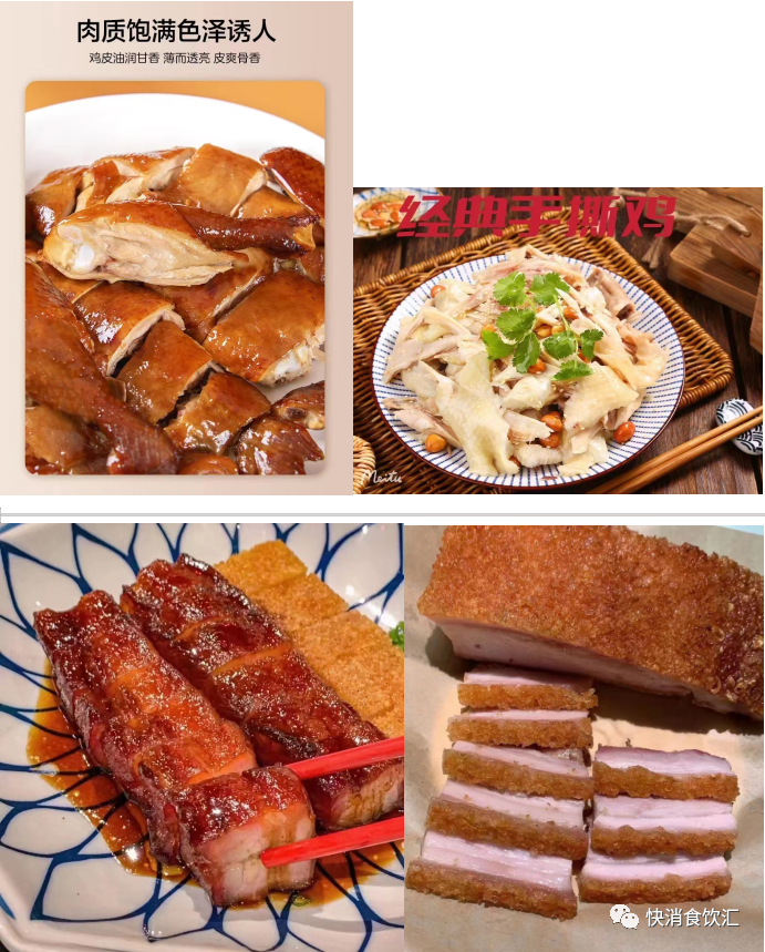 2.【拳头产品】鲜熟整黄鸡(白切、盐焗、豉油、五指毛桃、麻椒风味)、广式烧腊类(叉烧、烧肉、烧鸭)、潮汕牛肉丸、乳鸽等熟制品,冷藏保质期7天至1年,日常生活刚需品,消费者复购率高。