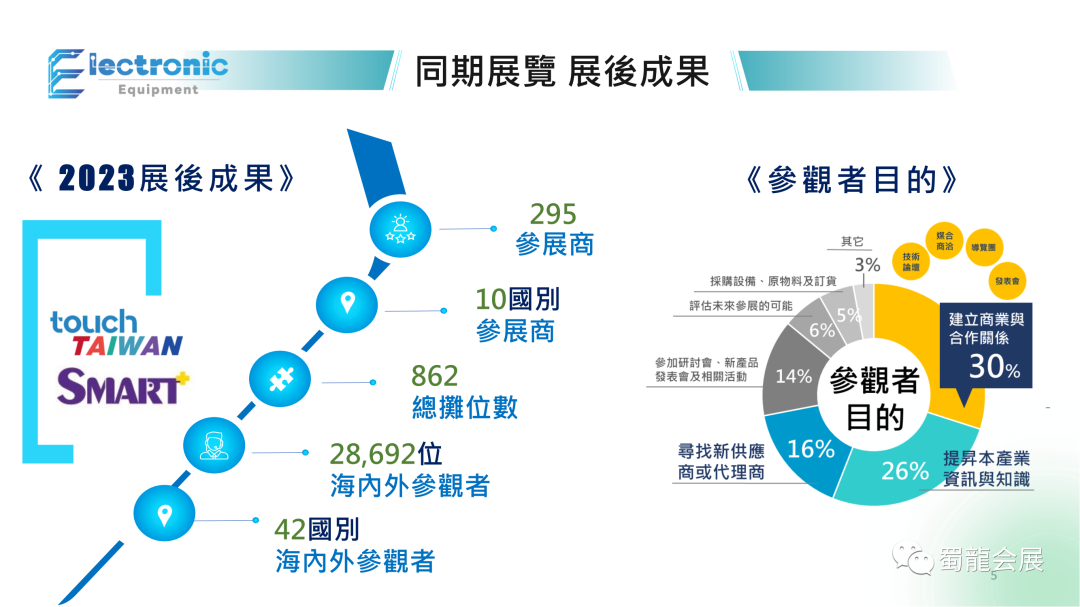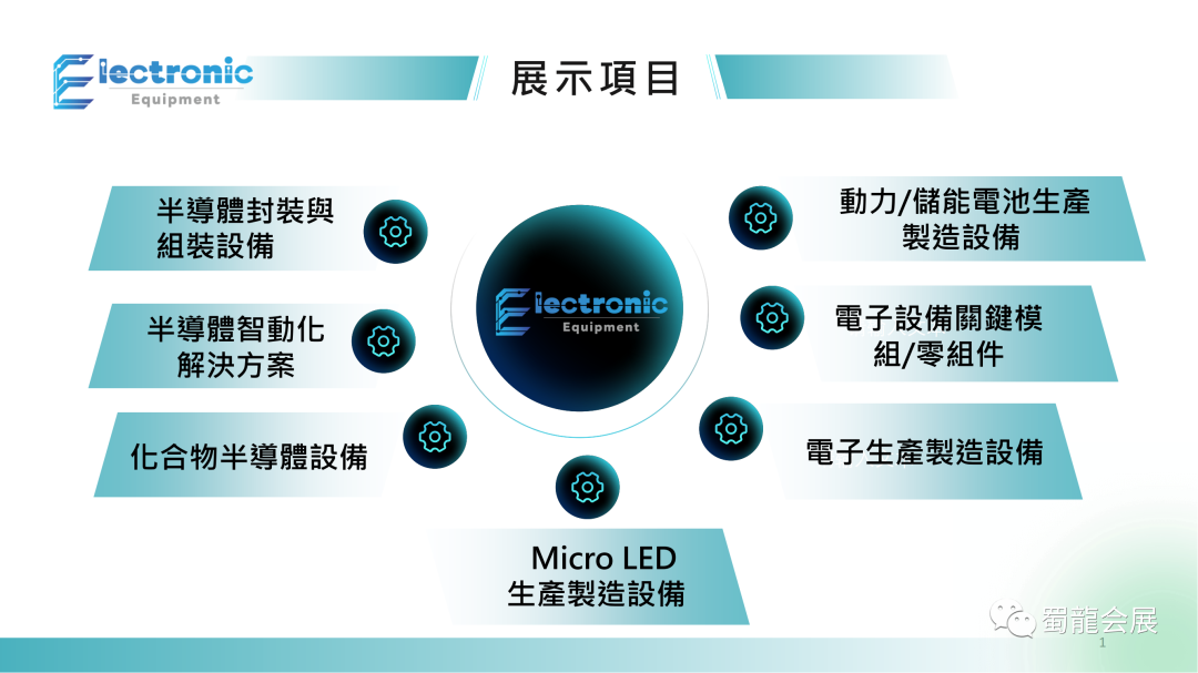2022年台湾电子生产设备产业产值已超过新台币4,000亿元、其中半导体设备产业产值超过1,400亿元,显示器设备产值已达1011亿元。在政府政策引导之下,全产业将力拼2030年台湾电子设备产值超过1兆元水准,俨然已跃升成为全球主要的发展项目。2024年台湾国际电子生产制造设备展将重点展示包含半导体封装与组装设备、电子生产制造设备、化合物半导体材料/设备等,将为参观者带来高附加价值之技术应用与解决方案,期望成为上半年最大的高科技商机合作平台,也希望藉由展会整合相关产业之能量,不只打造完整供应链,还为厂商带来潜在买主跟合作商机。