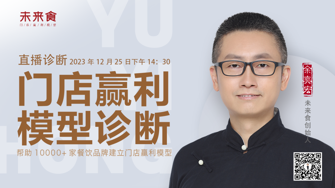 我们未来食在2020年疫情刚开始的时候,组织了公益的分享,给迷茫的餐饮人带来了很多有价值的分享,帮助大家共渡难关。现在又到一个消费力机具下滑的时代节点,接下来我会放更多时间跟大家见面,在视频号直播--《门店赢利模型诊断》,希望能够帮你找到门店的难点。