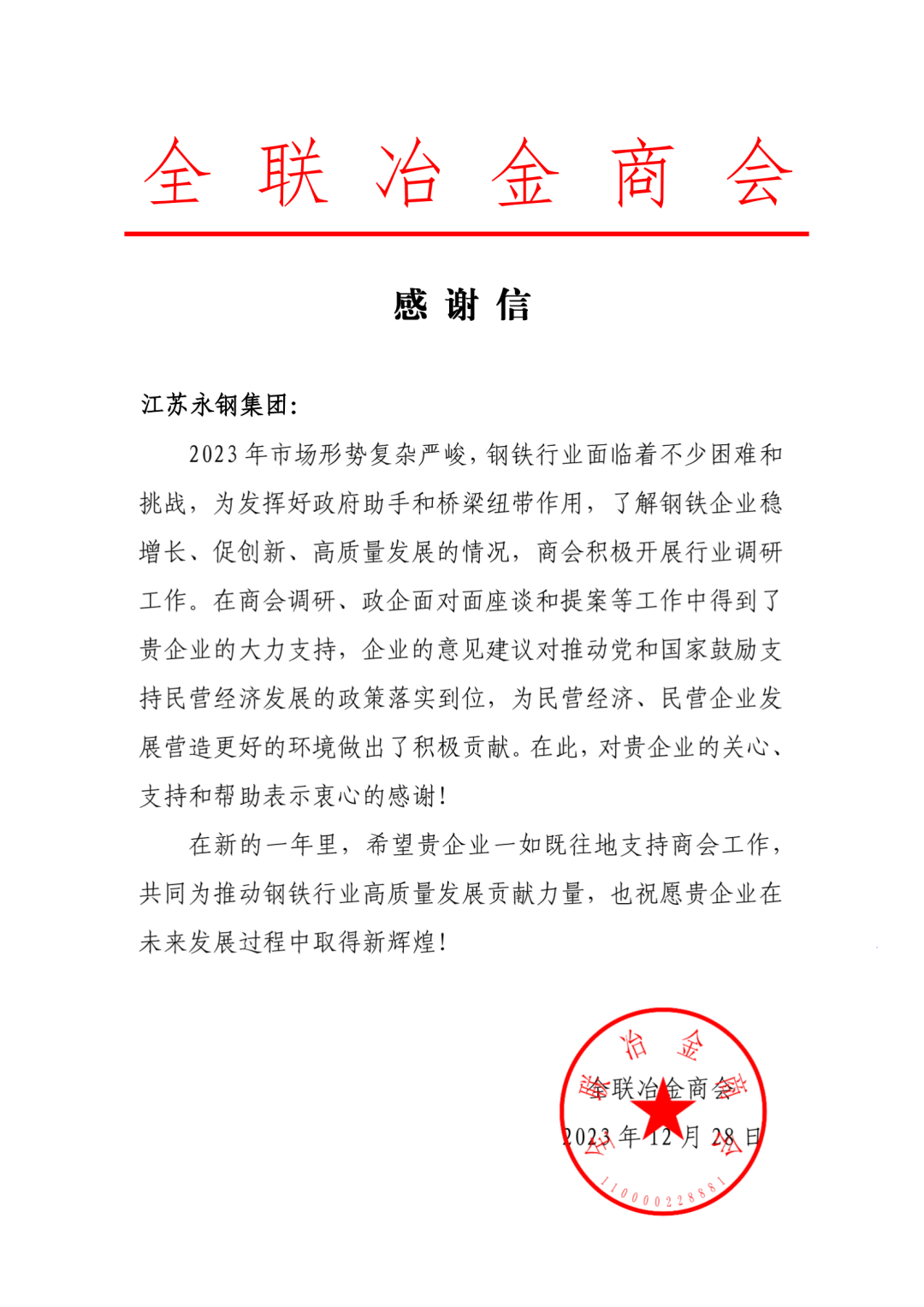 12月28日,永钢收到了一封来自全联冶金商会的感谢信。在信中,商会对永钢在商会调研、政企面对面座谈和提案等工作中所做的积极贡献表示了衷心的感谢。这封感谢信不仅是对永钢过去努力的肯定,更是对永钢未来发展的鼓励和期许。