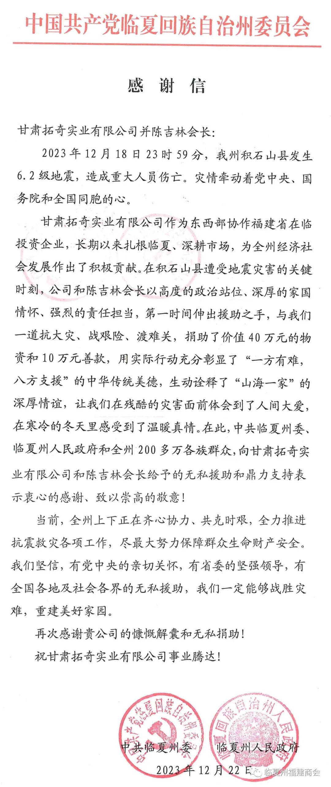 闽籍企业家向积石山县震灾区捐赠还在进行中……收到州委、州政府感谢信的还有: