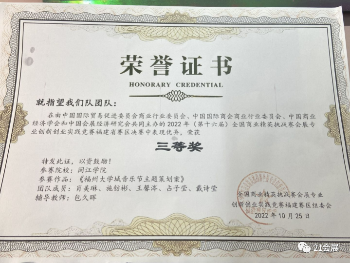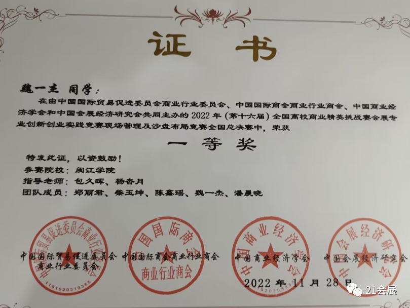 入学近1年半的时间,2021级会展经济与管理班在此次比赛以及前期的各项比赛中都取得了优异的成绩,班级成员田子仟,许嘉琦,游菁菁,施钫彬,王馨涔,魏一杰,吕柏贤等同学表现突出,在激烈的比赛中获得了不俗的成绩。分别获得了全国一等奖,全国二等奖,全国三等奖还有各类省级奖项。