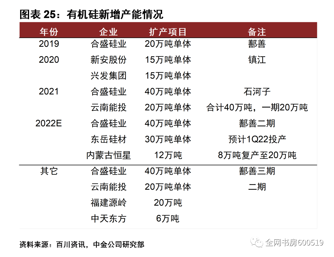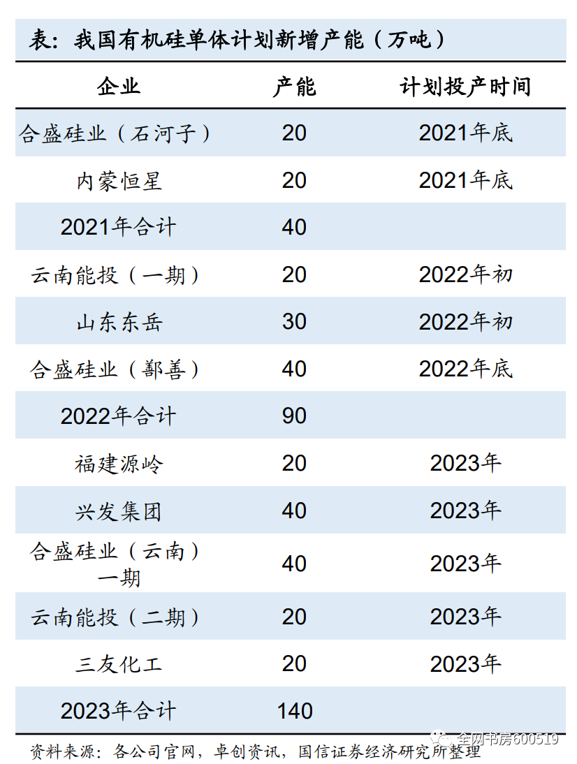 有机硅方面扩产的速度就要快于工业硅,合盛的两个20万吨项目将在一季度,以及年中分别投产,至于兴发的项目将在2023年底投产。