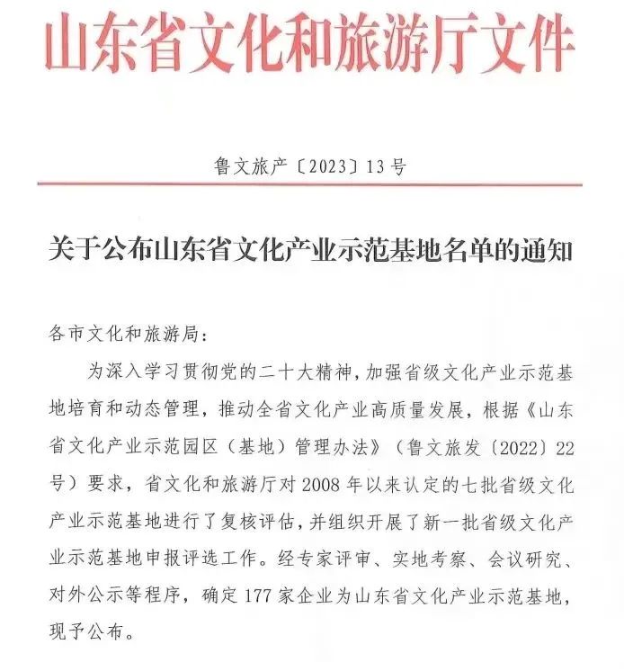 山东省文化产业示范基地是由山东省文化和旅游厅命名,经济效益和社会效益较为显著,在推动文化业态优化升级、促进文化产业创新发展等方面具有引领示范作用的企业。