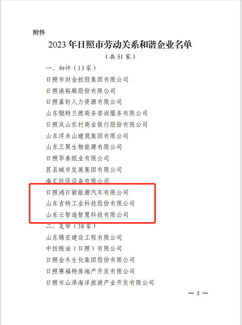 近日,五莲县3家工商联执委企业——日照鸿日新能源汽车有限公司、山东吉特工业科技股份有限公司、山东云智造智慧科技有限公司被认定为“日照市劳动关系和谐企业”。