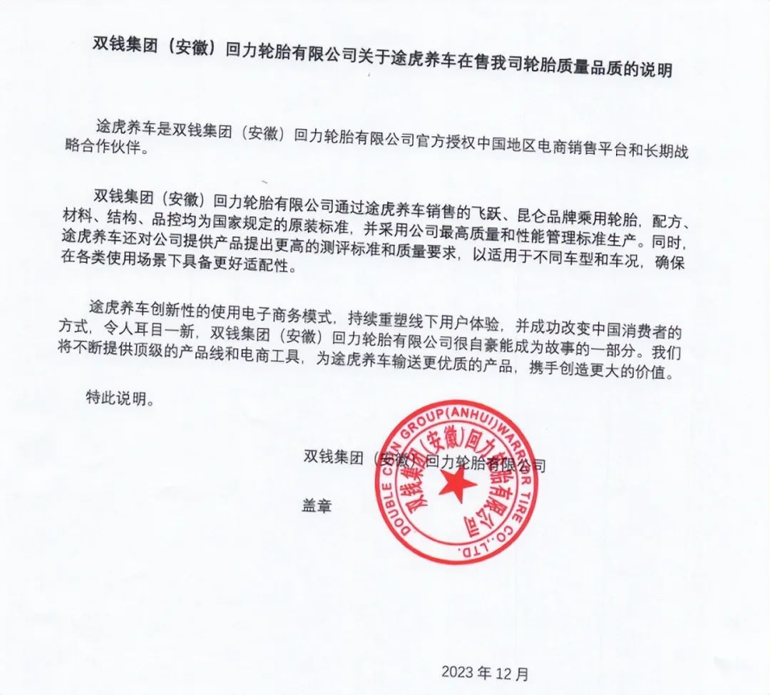 双钱集团(安徽)回力轮胎有限公司表示,双钱集团(安徽)回力轮胎有限公司通过途虎养车销售的飞跃、昆仑品牌乘用轮胎,配方、材料、结构、品控均为国家规定的原装标准,并采用公司最高质量和性能管理标准生产。同时,途虎养车还对公司提供产品提出更高的测评标准和质量要求,以适用于不同车型和车况,确保在各类使用场景下具备更好适配性。