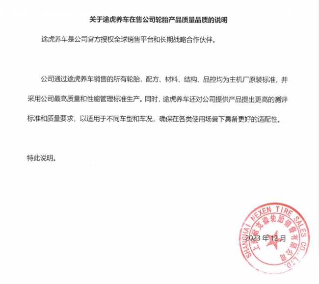 耐克森轮胎表示,公司通过途虎养车销售的所有轮胎,配方、材料、结构、品控均为主机厂原装标准,并采用公司最高质量和性能管理标准生产。同时,途虎养车还对公司提供产品提出更高的测评标准和质量要求,以适用于不同车型和车况,确保在各类使用场景下具备更好适配性。