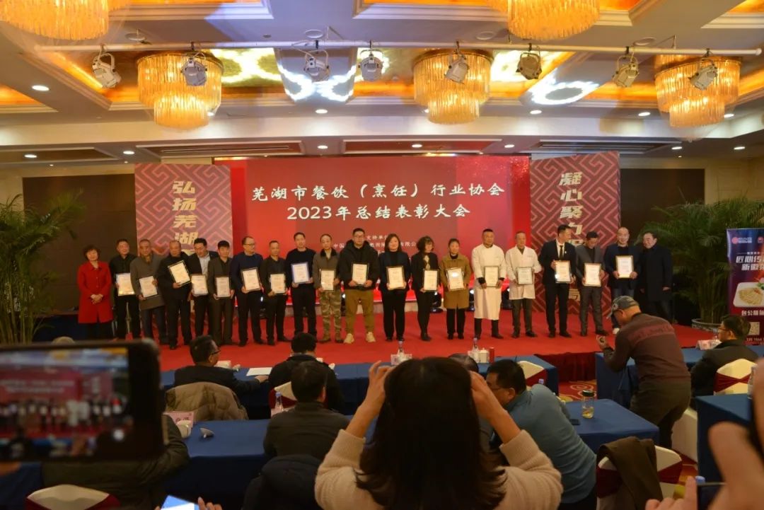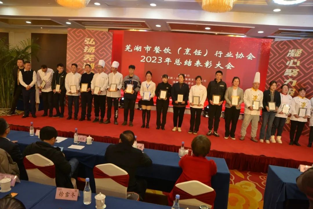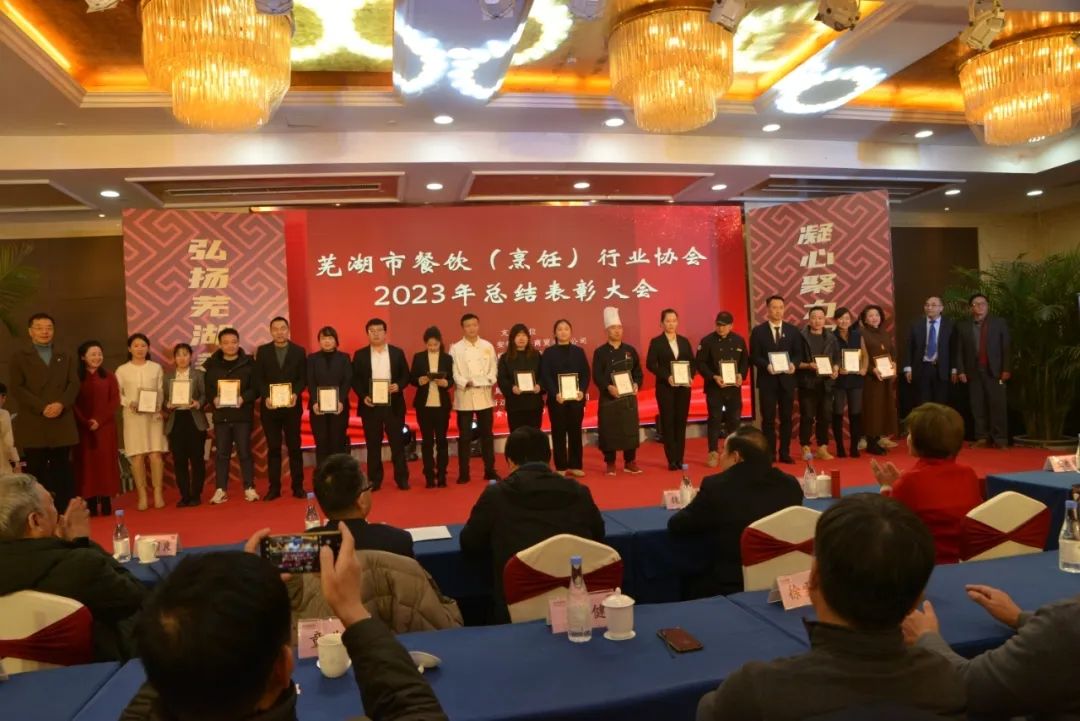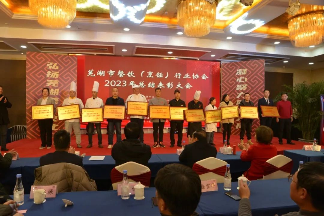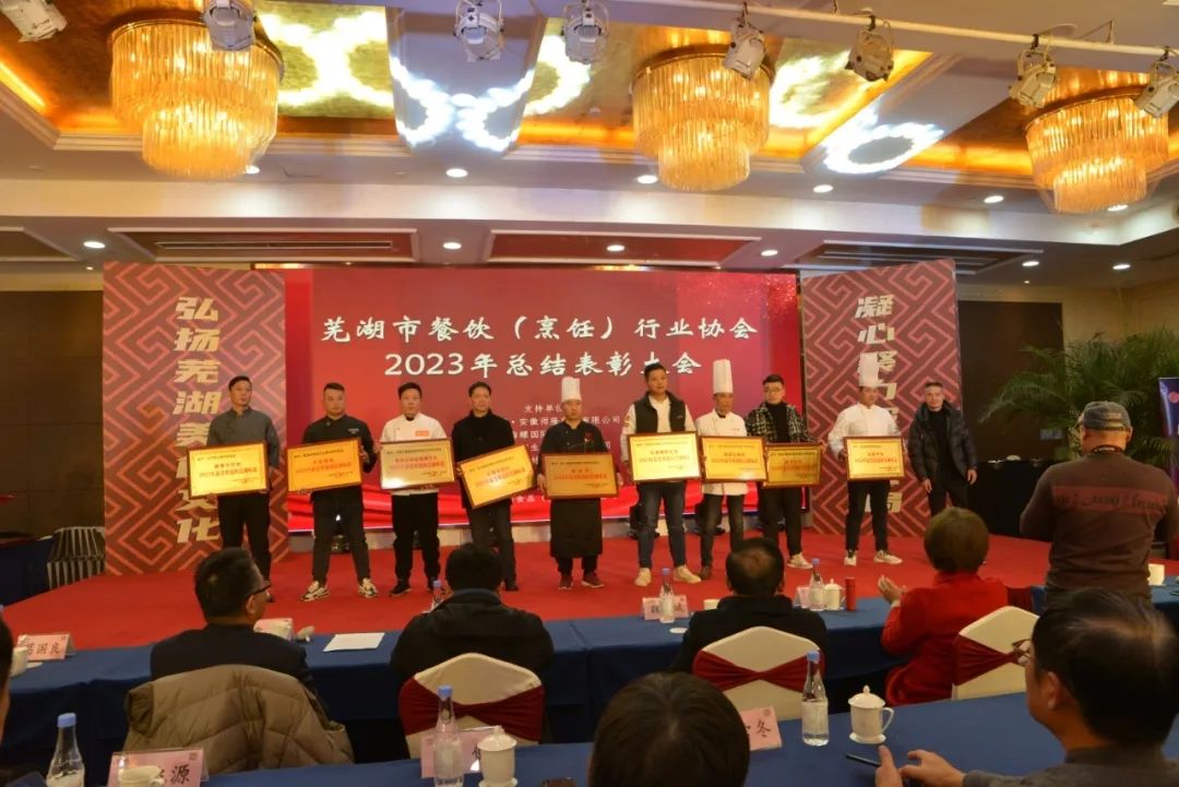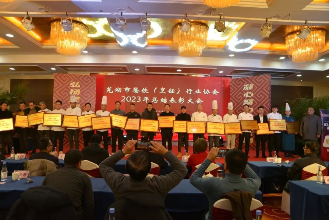 芜湖市餐饮(烹饪)行业协会对2023年度全市、市、区、县餐饮总结表彰大会在海螺国际大酒店召开,意义非常重大,大会全体起立,“唱国歌”。此次受表彰人员大都来自餐饮一线员工代表:有服务员,厨师,餐饮管理者,工会,党员代表等共400多人参加了大会。对一百八十名员工在2023年度做出贡献的个人逐项进行表彰。目的是激励宣扬他们在一线工作中辛辛苦苦做出的贡献与肯定。