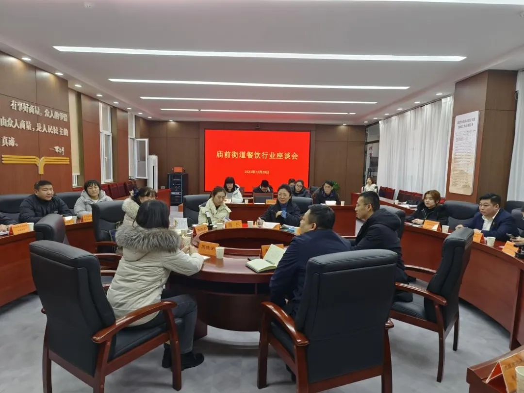 城市的“烟火气”离不开餐饮业的有序发展。为进一步优化企业发展环境,激活企业活力,增强发展动力。12月28日,庙前街道组织辖区重点餐饮企业进行座谈交流,听取企业对经济发展形势和民营经济发展的意见和建议,面对面为企业纾困解难,政企双方共商共谋辖区餐饮行业回暖之路。街道党工委负责人彭熠玮书记,街道党工委副书记、办事处主任张晓宇,太原市市场监管综合行政执法队迎泽区大队庙前中队队长李培文,街道办事处副主任高振东,庙前司法所所长张筱京,区人社局、劳动争议仲裁院、公共就业服务中心负责人及辖区十五家餐饮企业代表参会。