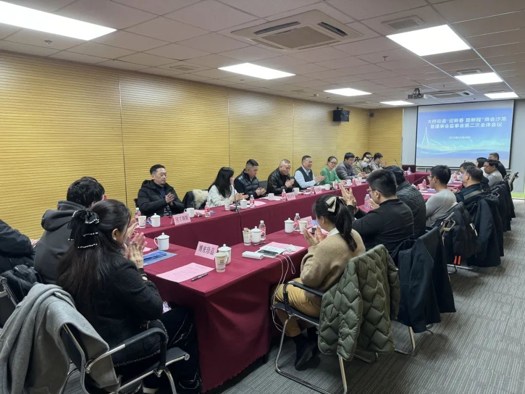 12月28日下午,大桥街道“迎新春 踏新程”商会沙龙暨理事会监事会第二次全体会议在城市概念园区顺利召开,街道人大工委副主任、营商办分管领导苏萍,区工商联会员部部长陆华出席会议。会议由大桥街道商会会长、上海欧坚网络发展集团股份有限公司董事长葛基中主持。