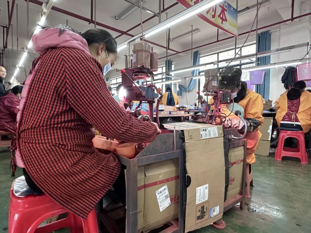 在丹都街道龙生社区微工厂的福珠朱砂工艺品加工厂内,工人们正在打磨、打孔、抛光朱砂半成品,赶制12月份刚接到的订单。