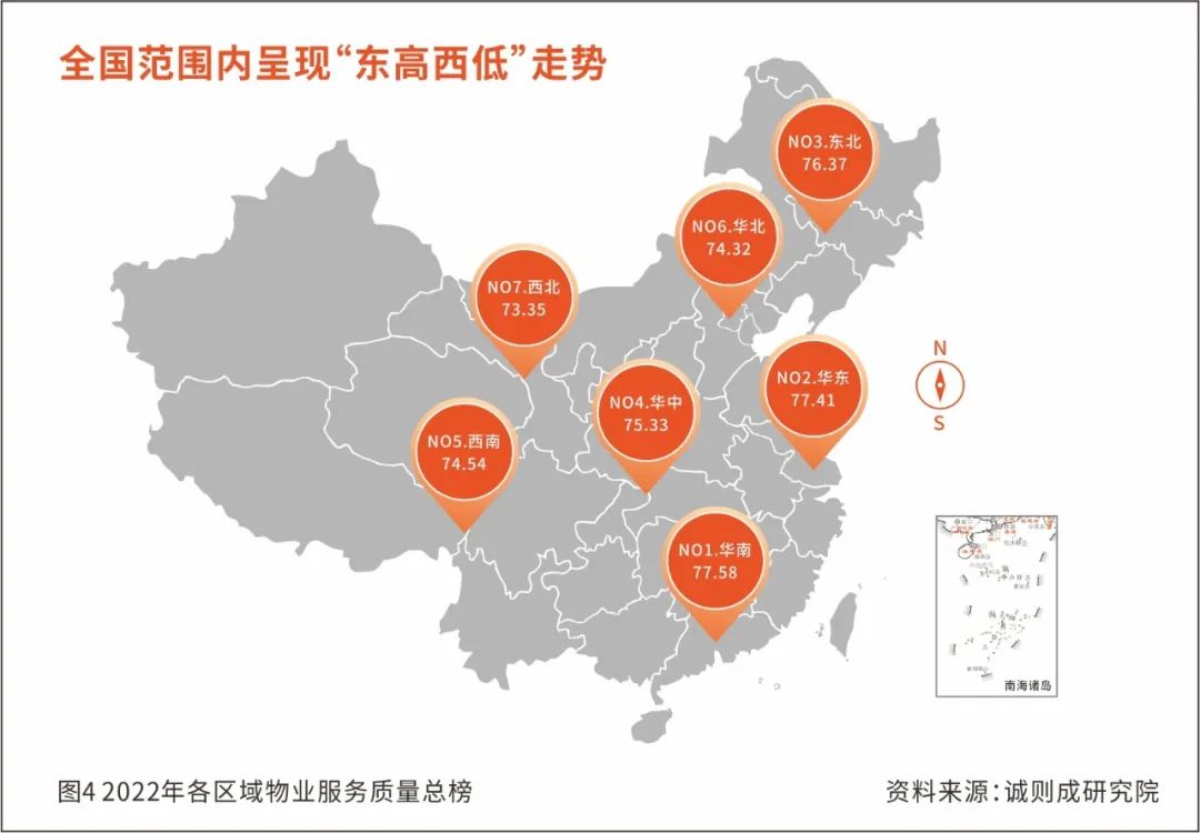 从地域角度来看,全国范围内物业服务质量呈现出“东高西低”的趋势。华南区域作为头部物企的聚集地,得益于总部强大的管控能力,其在物业服务方面的投入显著高于其他地区。华东区域排名第二,这主要得益于政策的支持和推动,如业委会监管措施、数字城市建设等,为企业提供了发展契机。