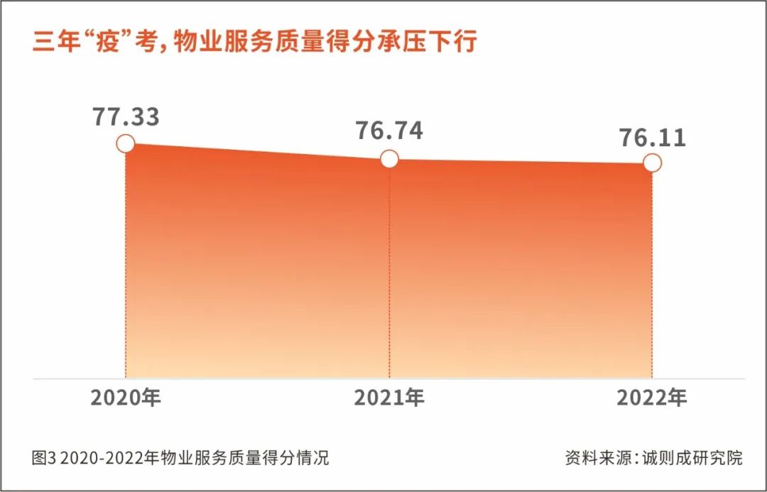 三年疫情期间,物业服务质量受到严峻考验。在多种因素影响下,服务质量得分有所下滑。首先,房地产市场进入存量时代,加之疫情冲击,企业的资金压力加大。其次,疫情防控分散了物业服务的精力,使其难以提供优质服务。此外,部分企业为了追求短期利润,降低了成本,甚至减少了品质管控的投入。