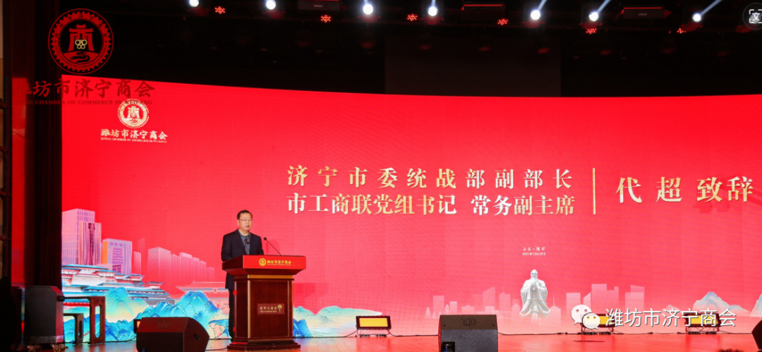 济宁市委统战部副部长、市工商联党组书记、常务副主席代超代表济宁市工商联、济宁市总商会对潍坊市济宁商会的成立表示热烈的祝贺!向在潍创业打拼的广大济宁籍企业家、各位济宁籍乡贤致以亲切的问候!