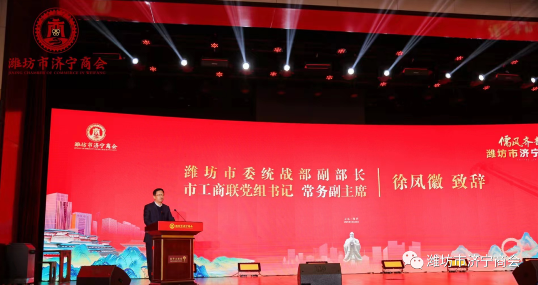 潍坊市委统战部副部长、市工商联党组书记、常务副主席徐凤徽上台致辞,他代表潍坊市工商联、潍坊市总商会,向大会的召开和第一届领导班子表示热烈的祝贺,向远道而来的济宁各位领导以及各地济宁商会的企业家们表示热烈的欢迎!