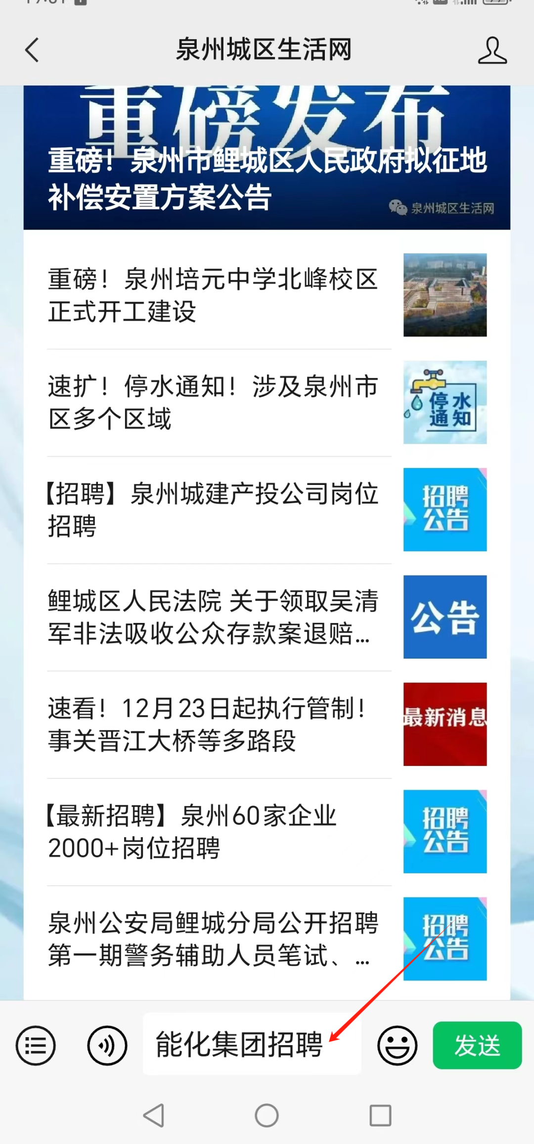 公众号对话框回复能化集团招聘即可下载报名表,岗位信息表及报名方式