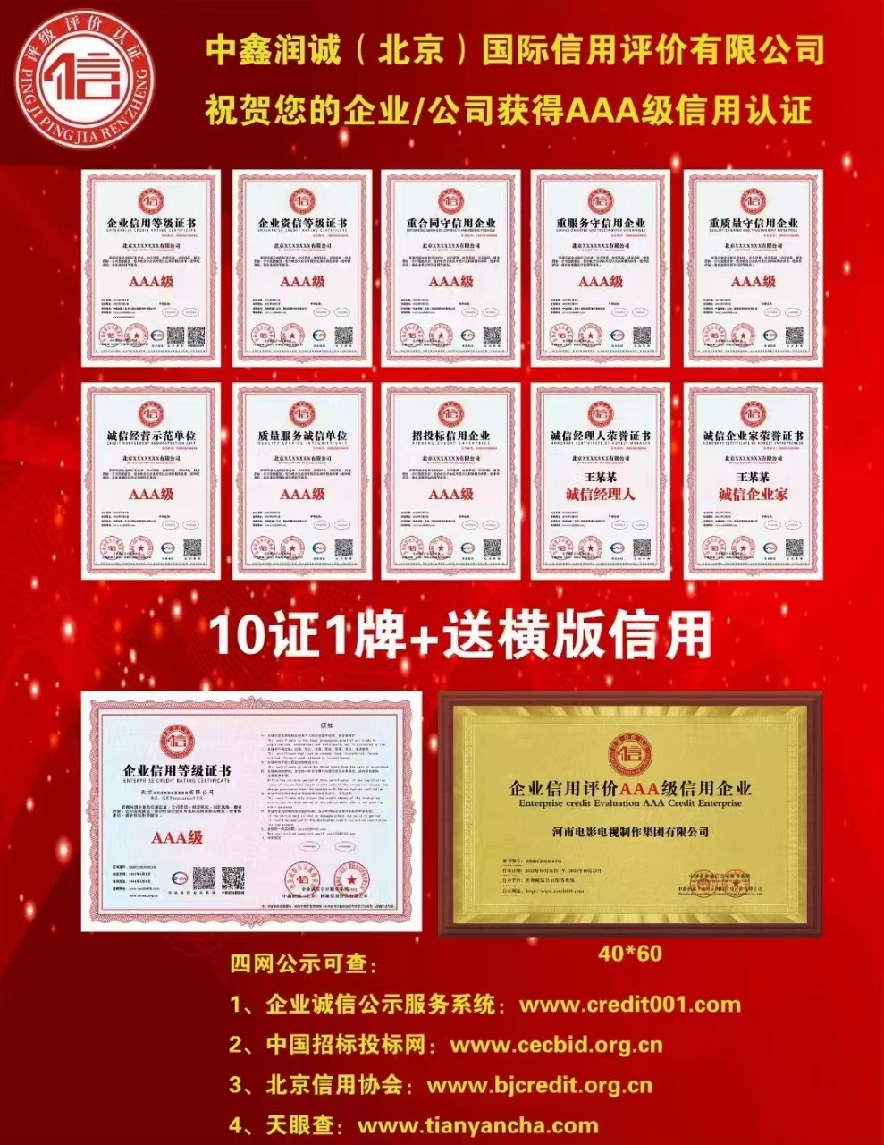 企业AAA信用评价证书,10证+1铜牌!