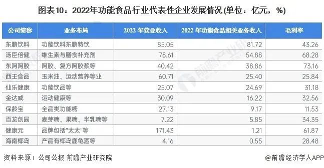 目前,我国原材料上游的代表企业包括同仁堂、九芝堂、金禾实业等。中游生产企业主要有汤臣倍健、东阿阿胶、西王食品、东鹏饮料、仙乐健康等。下游零售代表性企业包括天猫、淘宝、阿里健康等;大型连锁药店包括国大药房、老百姓、复美等