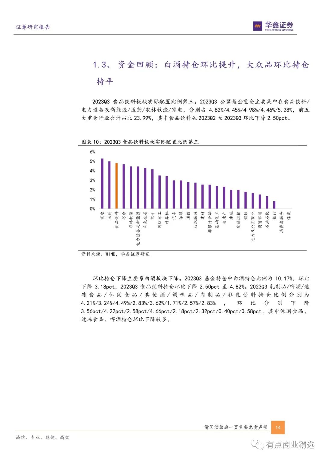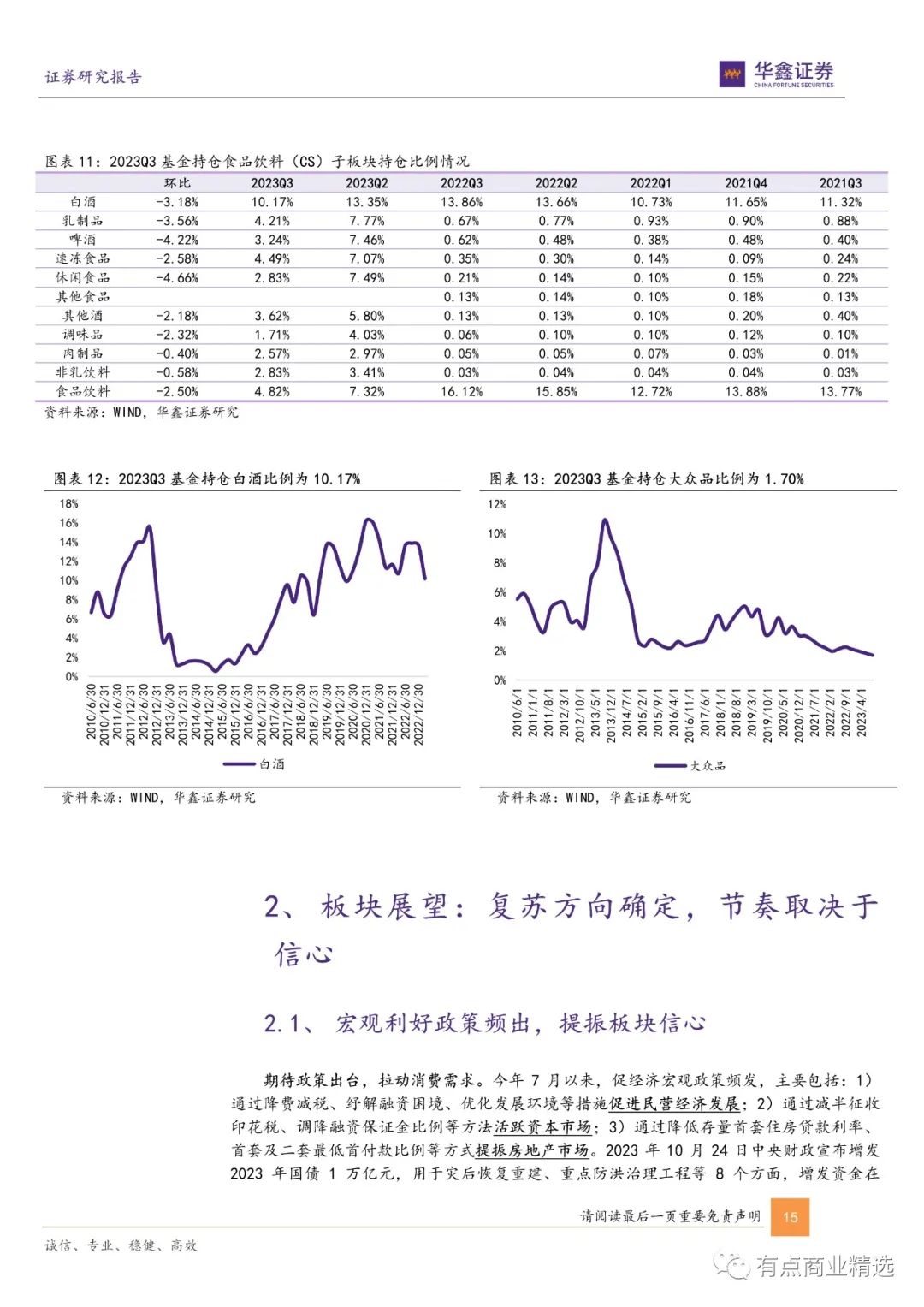 资 金 面 :2023Q3 公 募 基 金 重 仓 食 品 饮 料 占 比4.82%,从 2023Q2 至 2023Q3 环比下降 2.50pct。其中,白酒持仓比例为 10.17%,环比下降 3.18pct;啤酒/速冻食品/休闲食品 / 调味品 / 非 乳 饮 料 持 仓 比 例 环 比 分 别 下 降4.22pct/2.58pct/4.66pct/2.32pct/0.58pct , 其 中 休 闲 食品、速冻食品、啤酒持仓环比下降较多。