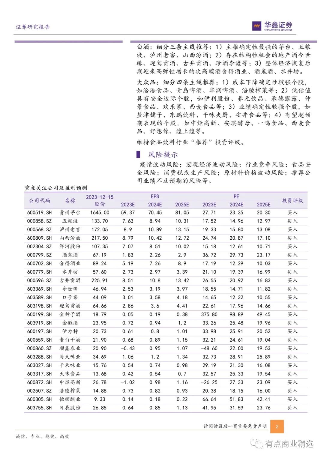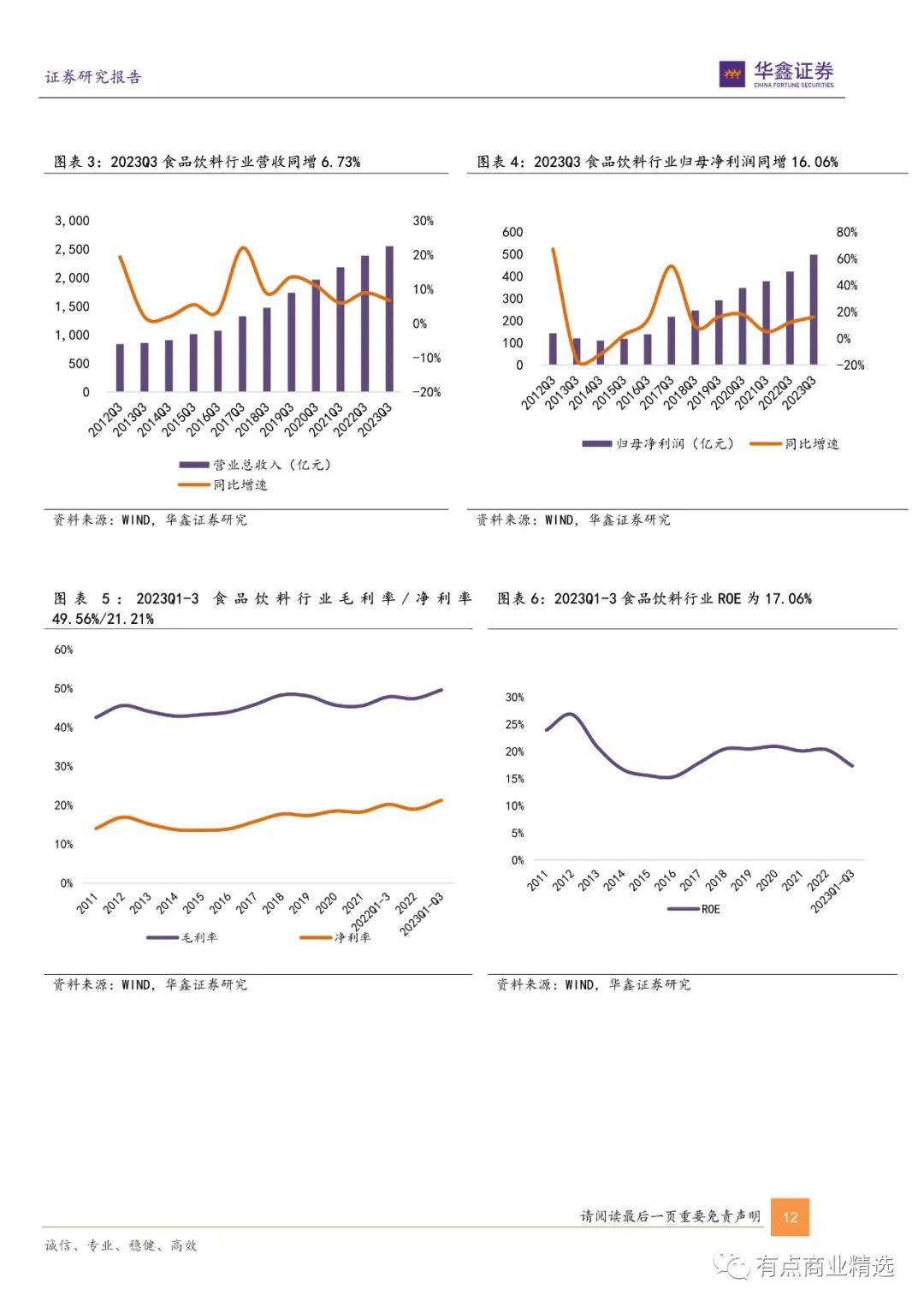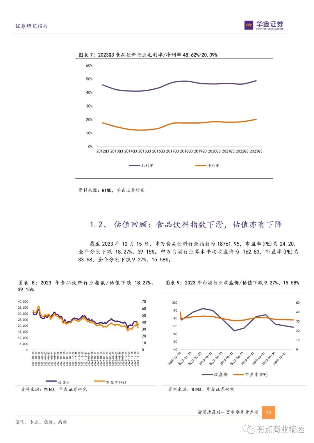 2023 年前三季度申万食品饮料行业板块营收和归母净利润分别为 7896.83、1622.88 亿元,分别同增 8.61%、15.27%;毛利率和净利率分别为 49.56%、21.21%,同增1.76pct、1.07pct;ROE 为 17.06%,同比上升 0.96pct。估值面:截至 2023 年 12 月 15 日,申万食品饮料行业指数为18761.95,市盈率(PE)为 24.20,全年分别下跌 18.27%、39.15% 。