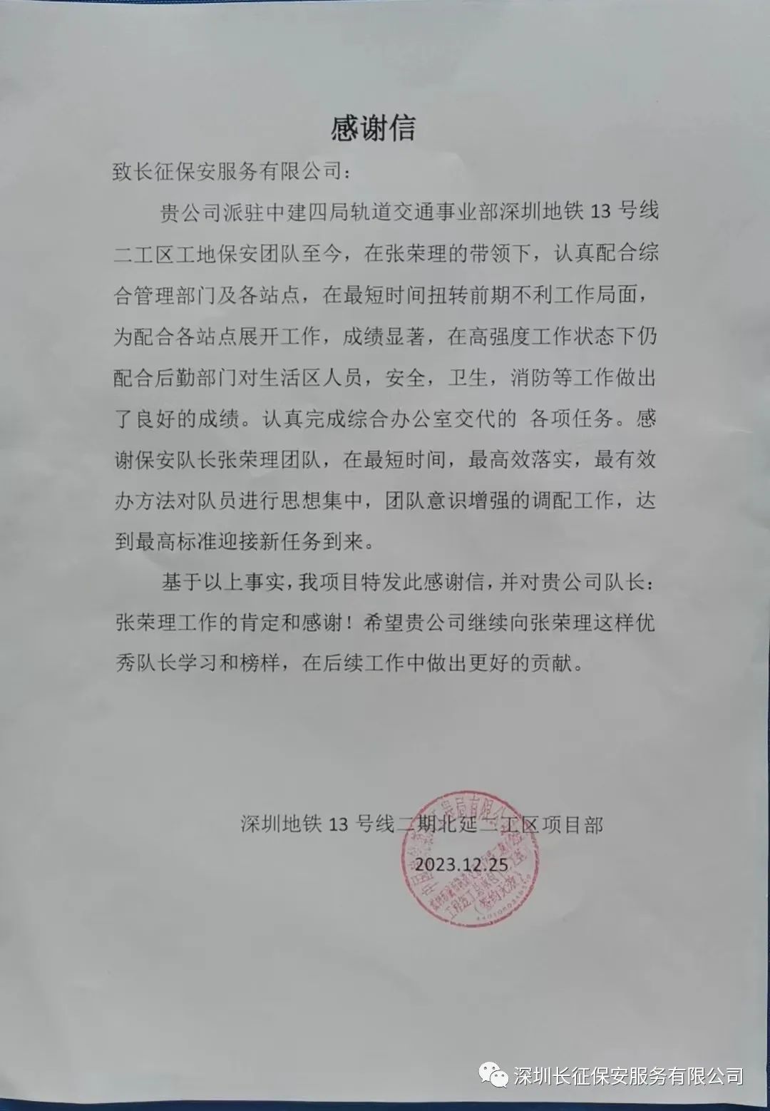 信中表示,在公司安保队长张荣理的带领下,安保团队人员各司其职,配合客户单位高效开展工作,成绩显著,在高强度工作状态下仍配合后勤部门对生活区人员、安全、卫生、消防等工作做出了良好成绩,保质保量地完成了综合办公室交代的各项任务。